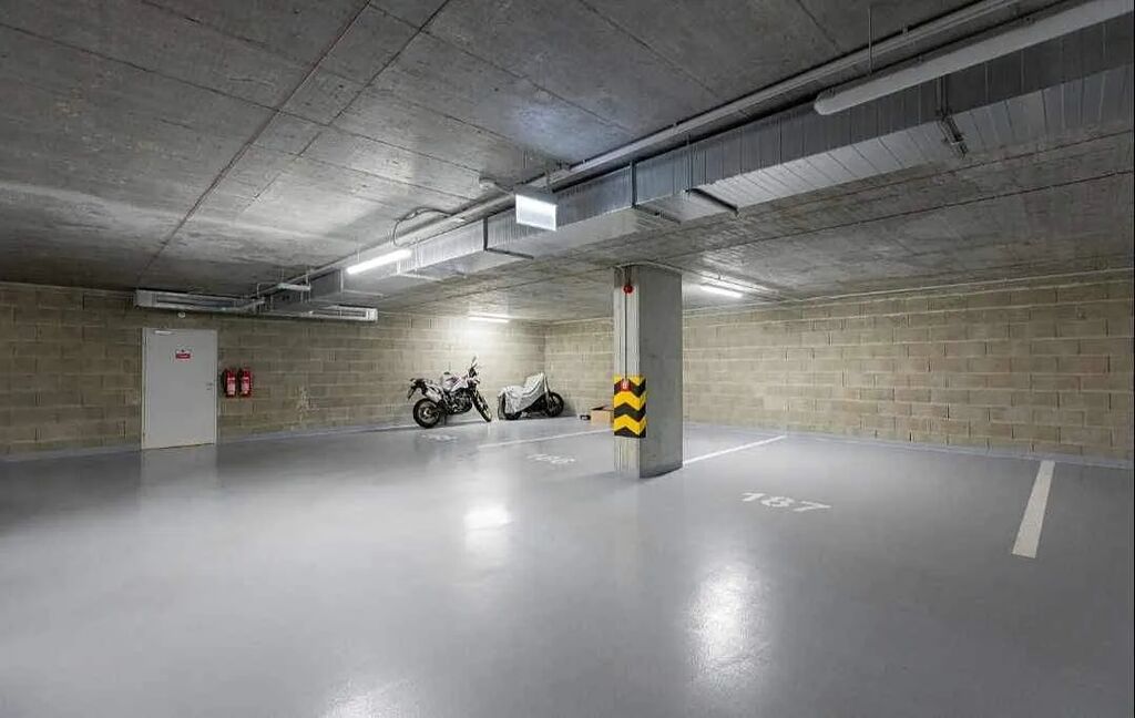 K bytu náleží prostorná sklepní kóje 4 m2 a nadstandardní, rozšířené garážové stání (18 m2, vejde se auto s motorkou) v druhém podzemním podlaží téže budovy.