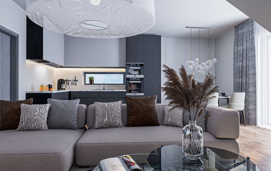 Prostorný a světlý obývací pokoj s kuchyňským koutem, přípravou pro krb a velkým francouzským oknem na terasu s výhledem na zahradu – ideální místo pro ranní kávu.