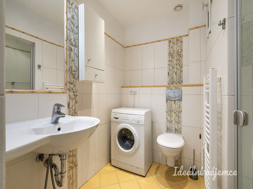 Byt se nabízí částečně nevybavený. Kuchyně disponuje lednicí, myčkou, elektrickou troubou, varnou deskou a digestoří. V koupelně sprchový kout, umyvadlo a pračka.