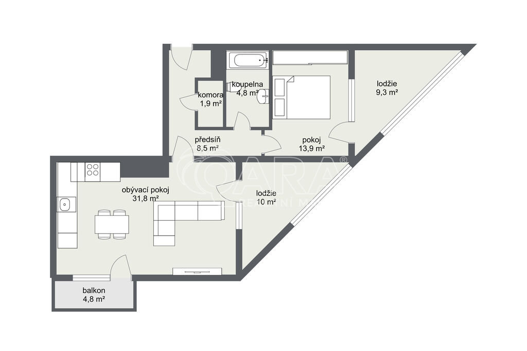 Nabízíme ke koupi byt 2+kk o nadstandardní podlahové ploše 65,8 m2, která je ještě doplněna dvěma lodžiemi 10 m2 a 9,3 m2 a dále ještě balkonem dalších 4,8 m2. K tomu všemu navíc sklep o velikosti 3,9 m2 a rozšířené parkovací stání. Celkem tedy získáte komfortních téměř 94 m², které vám poskytnou prostor i pohodlí, jaké běžně nabízejí byty 3+kk.
