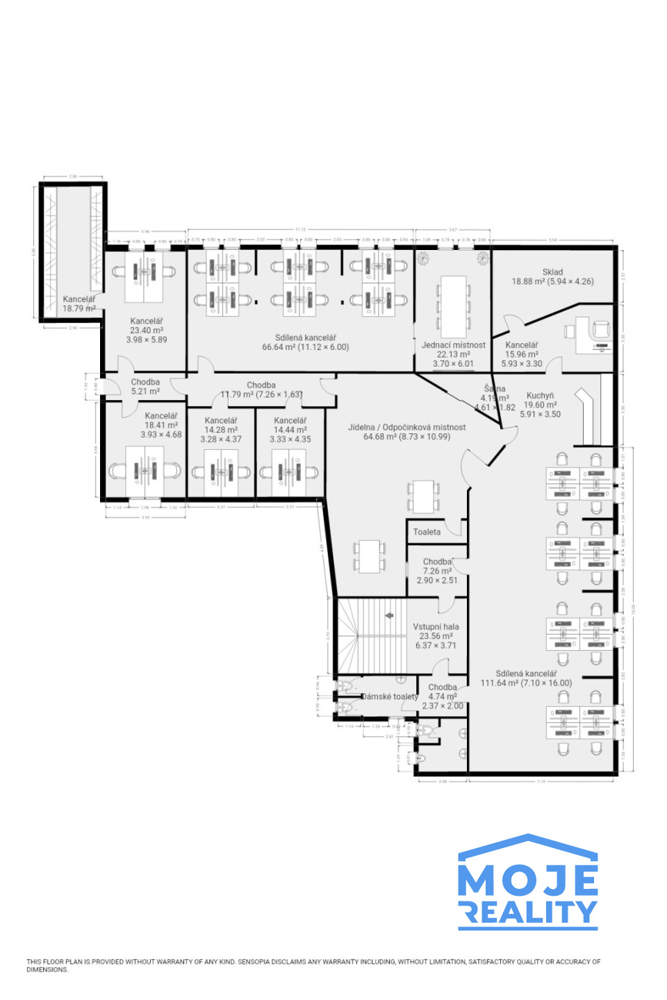 Prostory se nachází v nejvyšším patře budovy, jsou klimatizované a jsou členěny do několika samostatných kanceláří, dvou velkorysých sdílených open space prostorů, zasedací místnosti, kuchyňky, jídelny/odpočinkové zóny a skladu.