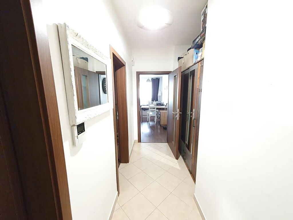 pokoj s moderní plně vybavenou kuchyňskou linkou se vstupem na terasu a zahradu, předsíň, komora, prostorná koupelna se sprchovým koutem a toaletou. Garážové stání a sklep.