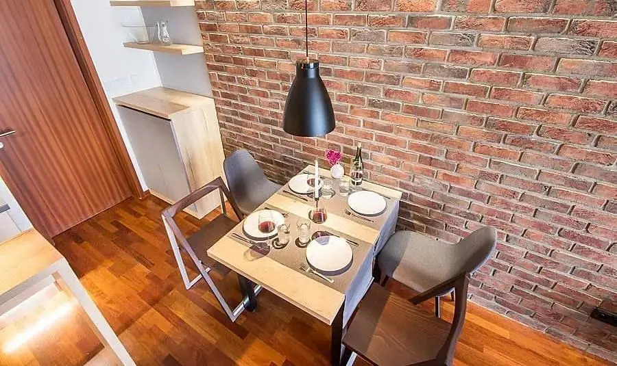 Byt je plně vybaven moderním nábytkem, kuchyňskou linkou včetně veškerého vybavení (nádobí, příbory, kávovar atd.), televizí se satelitním příjmem a vysokorychlostním internetem, který je již zahrnut v ceně nájmu.