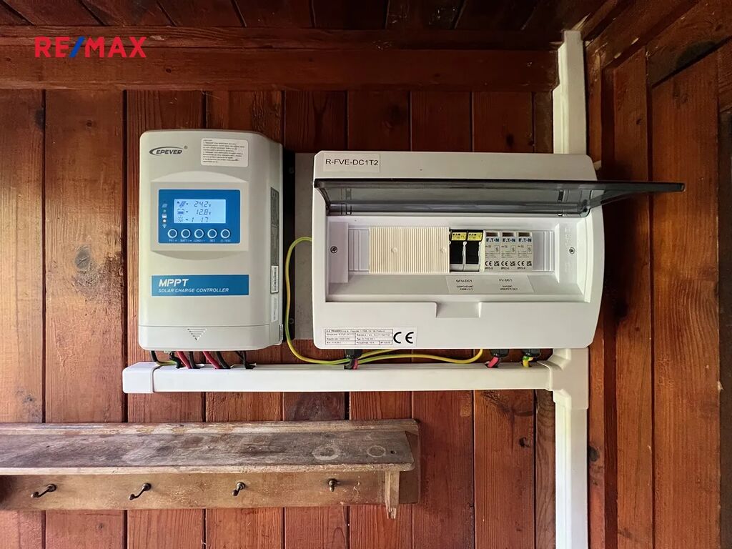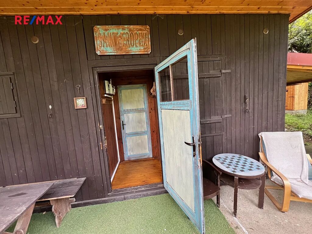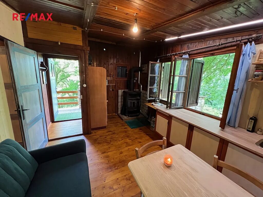 Romantický interiér nabízí obývací místnost s kuchyní a kuchyňskou linkou, stolem a židlemi, rozkládací gauč, krbová kamna. V pokoji se budete cítit jako u babičky, nebo jako na francouzském venkově... Manželská postel, obrázky, petrolejka, vůně přírody otevřeným oknem na terasu... Užitná plocha 25 m2, přivedena voda z IBC nádrže, na střeše solární panely s baterií a rozvodem po chatě na základní svícení a spotřebiče. U chaty je zbrusu nová latrína...