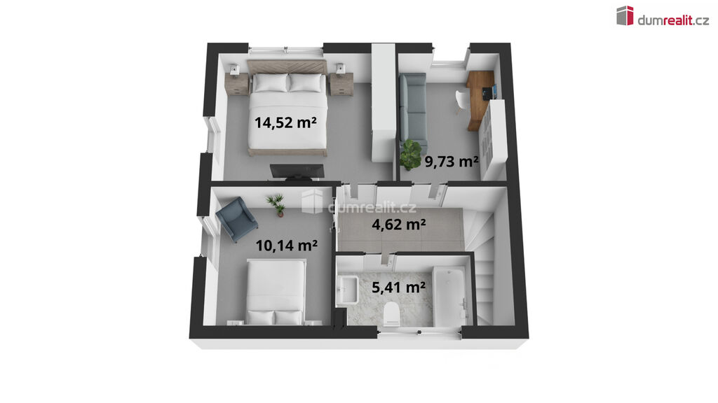 V patře najdete tři samostatné neprůchozí pokoje a druhou koupelnu s WC.