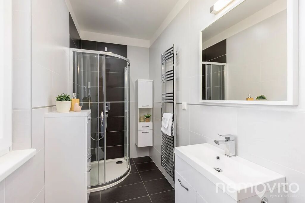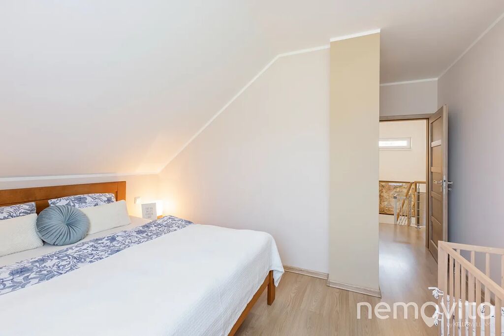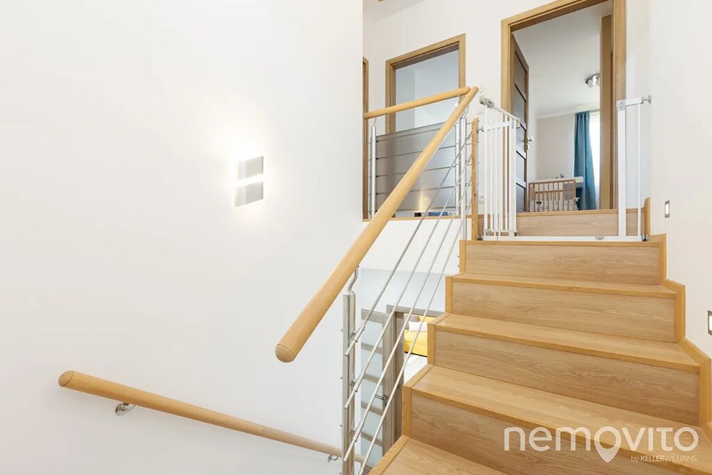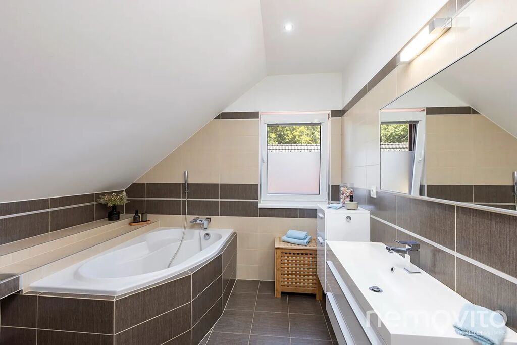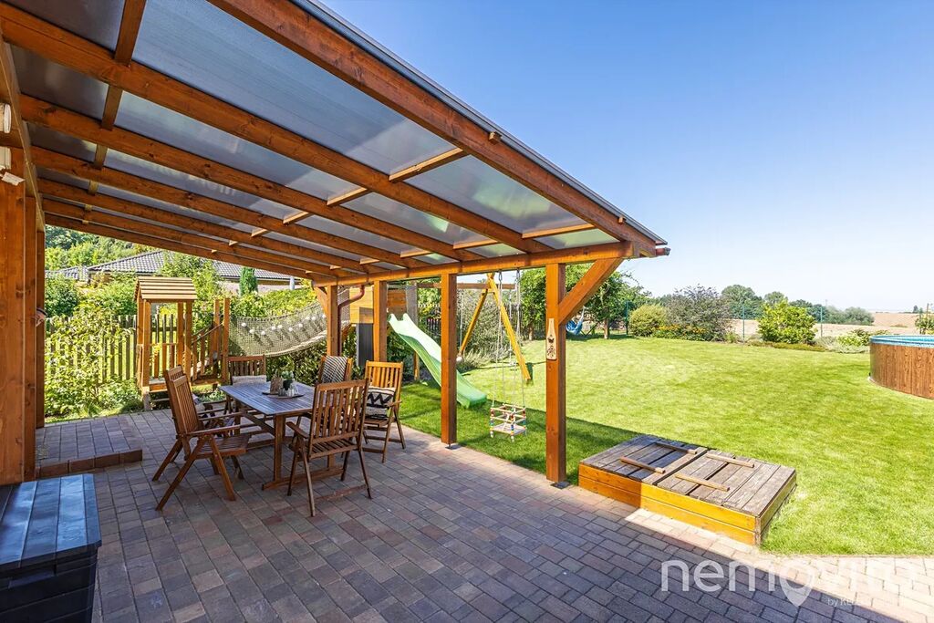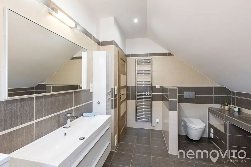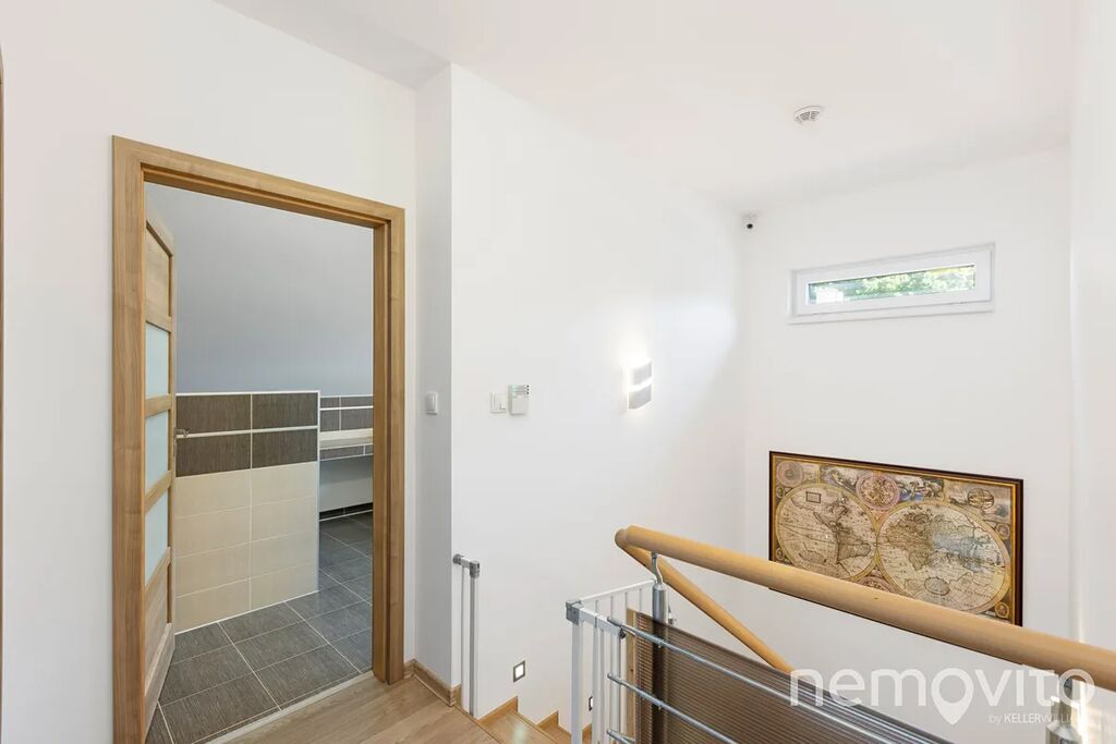 Všechny 3 ložnice jsou pak nahoře, přičemž k jedné náleží vlastní šatna. Velká koupelna s rohovou vanou má k dispozici klasické okno, přestože je v podkroví. To je využité beze zbytku, protože nad celým domem je velká půda, a to samé platí o prostoru nad krytým parkingem pro 2 auta s nabíječkou (cca 50 + 40 m2 na půdách). Porci úložného prostoru pak doplňuje ještě zahradní domek (ZP 25 m2) v zadní části zahrady, ve které nechybí také bazén. Výhled je volný směrem na pole, které je aktuálně stavebně nevyužitelné.