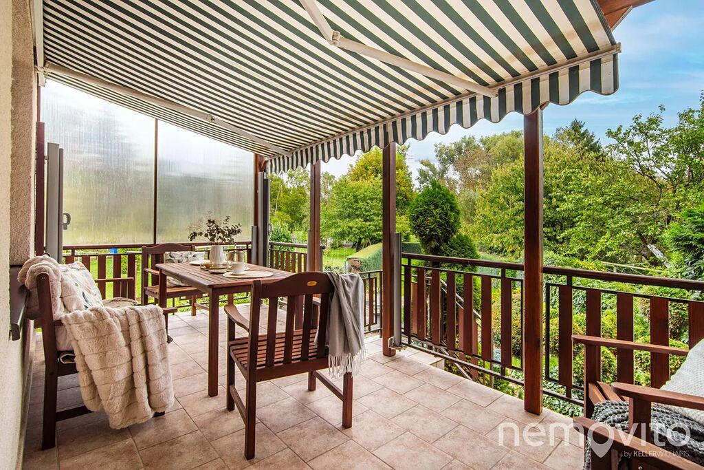 Zahrada o rozloze 527 m² nabízí díky živým plotům a okrasným dřevinám příjemné posezení u zahradního krbu i prostor pro vlastní pěstování. O trávník se stará automatický zavlažovací systém Hunter. Nechybí ani vyvýšená zastřešená terasa (12 m²) s mobilním zavětrováním, kterou využijete i za nepříznivého počasí.