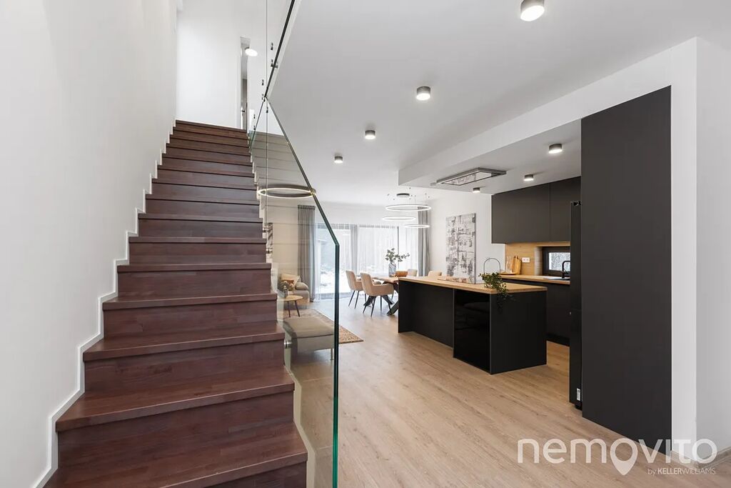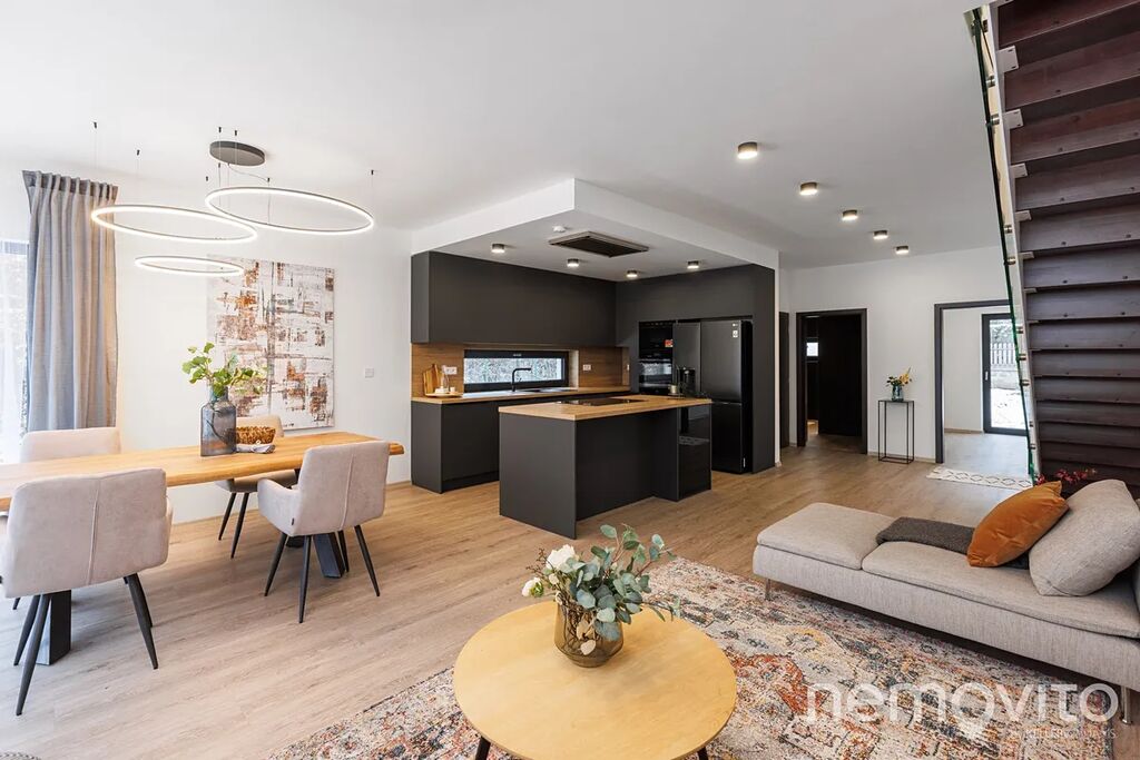 Dvoupodlažní dům se třemi koupelnami, jejichž provedení prozrazuje vyšší standard domu, je klasické zděné konstrukce. Hlavní prostor tvoří obývák s velkou kuchyní (cca 45 m2) s proskleným rohem směrem na zahradu. Linka provedená v černém matu koresponduje se zbytkem interiéru - od vestavěných skříní ve vstupním zádveří, po barevné ladění sanity nebo dveří. Dole se nachází také nejmenší pokoj (pro hosty nebo pracovna), vedle kterého je první z koupelen. Ta je kombinovaná s technickou místností. Do té je soustředěno vytápění (tepelné čerpadlo) a místo pro prádelnu.