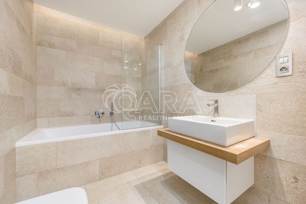 Byt je kompletně vybaven na míru zhotovenou kuchyňskou linkou s vestavěnými spotřebiči zn. Bosch (indukční varná deska, pečící a mikrovlnná trouba, digestoř, lednice s mrazákem, myčka i kávovar). Součástí vybavení je dále i jídelní stůl se židlemi, sedací souprava, televize, dvoulůžková postel s matracemi. Koupelna je s vanou vč. sprchové zástěny. Podlahy v bytě jsou velmi kvalitní dřevěné, v koupelně a na chodbě je dlažba.