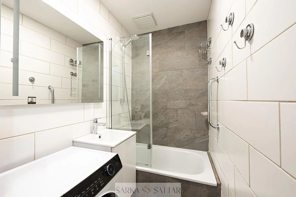 - koupelnu s vanou, sprchovou zástěnou umyvadlem a pračkou