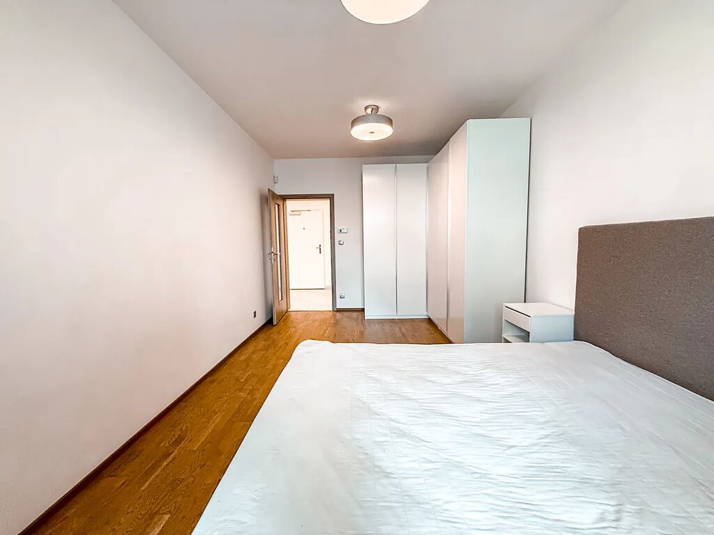 Dispozice zahrnuje obývací pokoj s plně vybavenou kuchyňskou linkou (trouba, varná deska, digestoř, myčka, lednice), ložnici, koupelnu s vanou a pračkou, samostatnou šatnu a prostornou terasu orientovanou do klidného vnitrobloku. Na terasu je přístup jak z obývacího pokoje, tak i z ložnice.