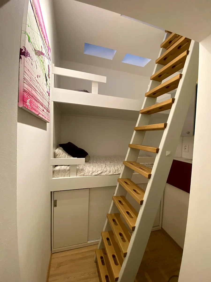 dětský pokoj s palandou a vstupem do věže (pracovna, knihovna)