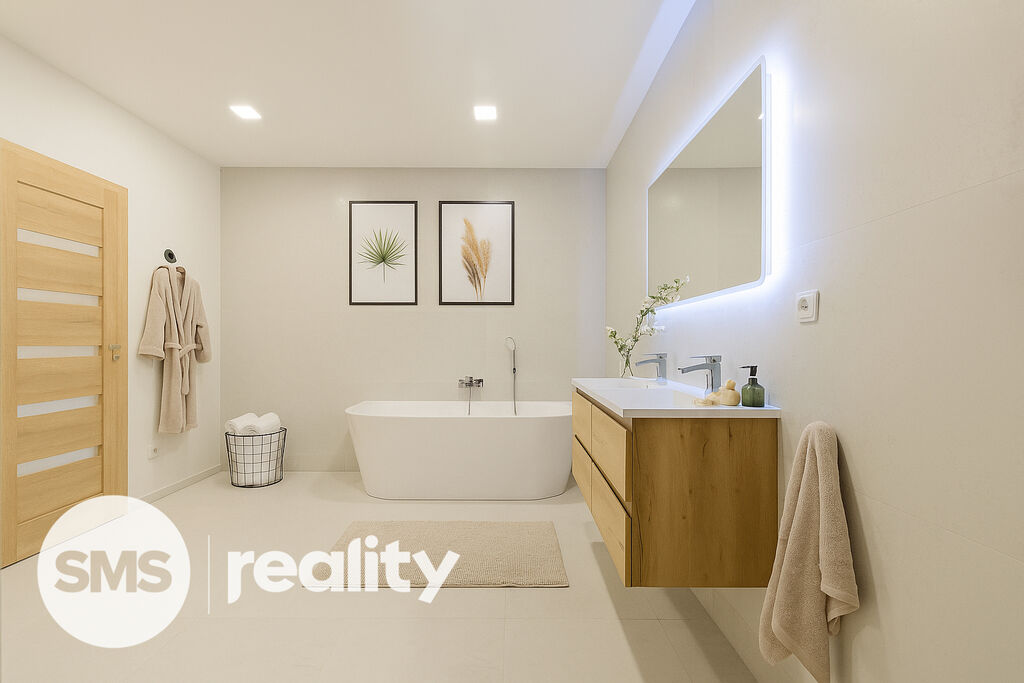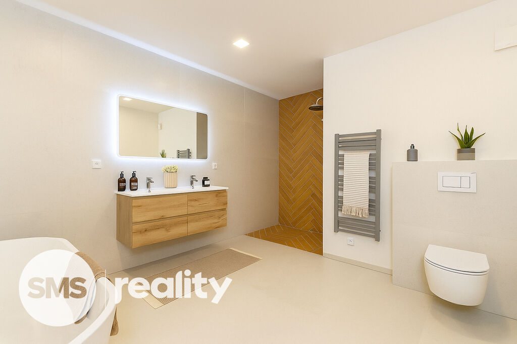 Na levé straně domu se nachází technická místnost, luxusní koupelna a čtyři samostatné pokoje, které poskytují dostatek prostoru pro dětské pokoje, pracovnu či pokoj pro hosty. Koupelna, která je dominantou celého interiéru, zaujme elegantním designem, kvalitními materiály a promyšleným vybavením – nechybí zde vana, sprchový kout ani toaleta. Technická místnost je umístěna přímo vedle verandy, což zajišťuje snadný přístup a pohodlné využití prostoru.
