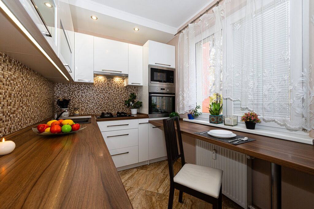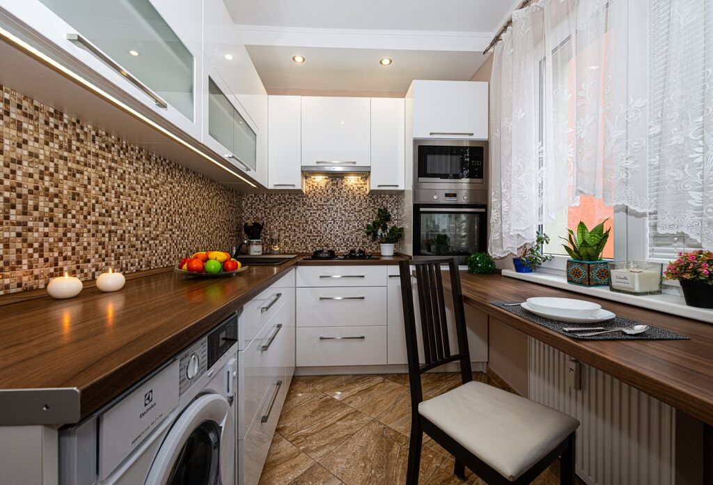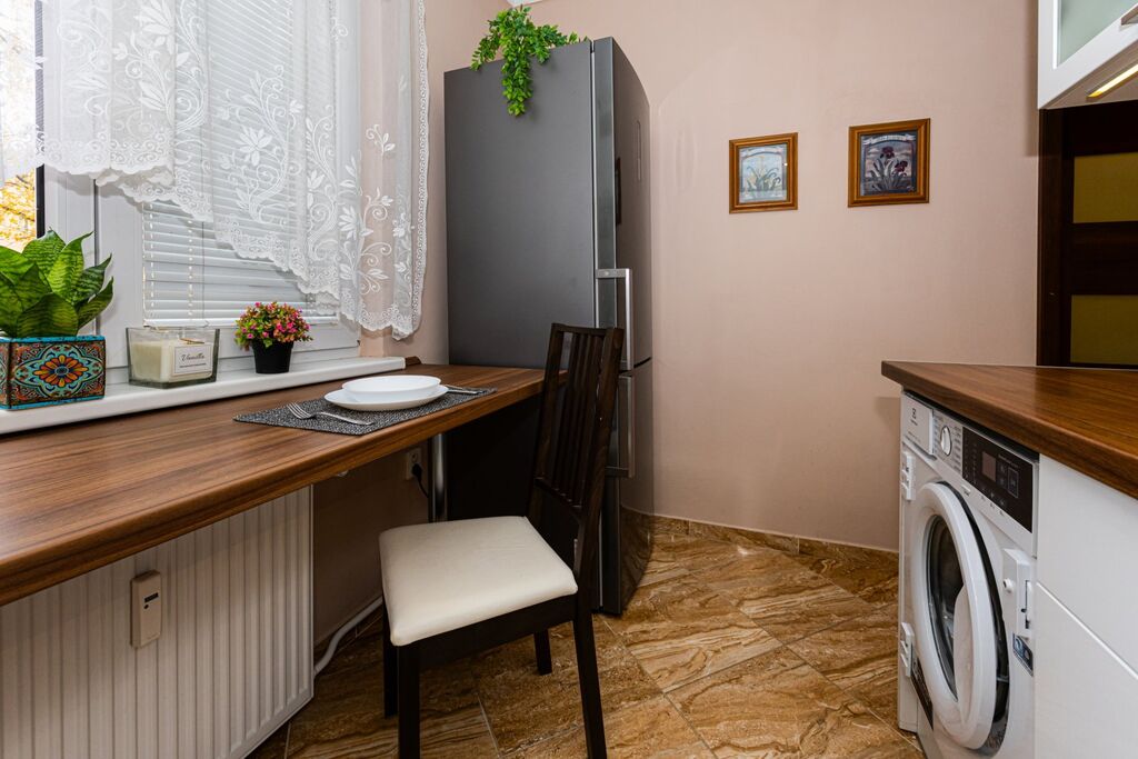 Byt je ihned obyvatelný bez dalších investic, prodává se s kuchyňskou linkou a vestavnými spotřebiči (trouba, mikrovlnka, sporák, nová pračka 2025, lednice).