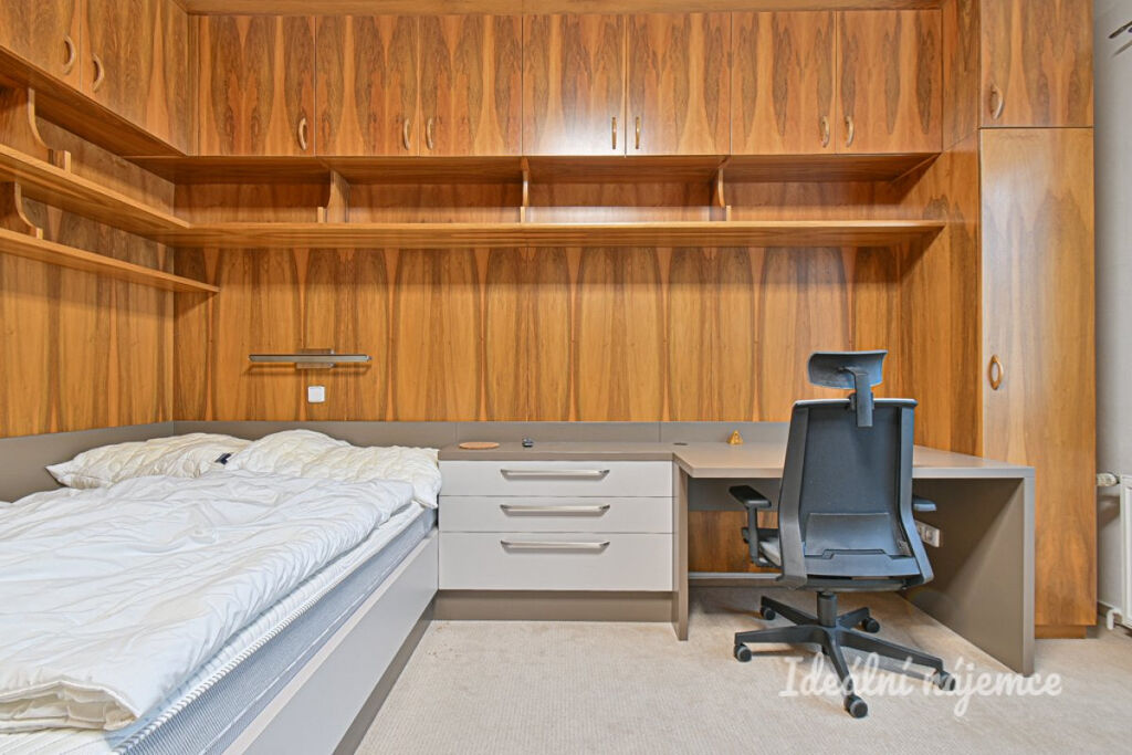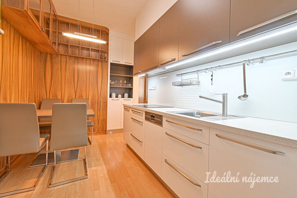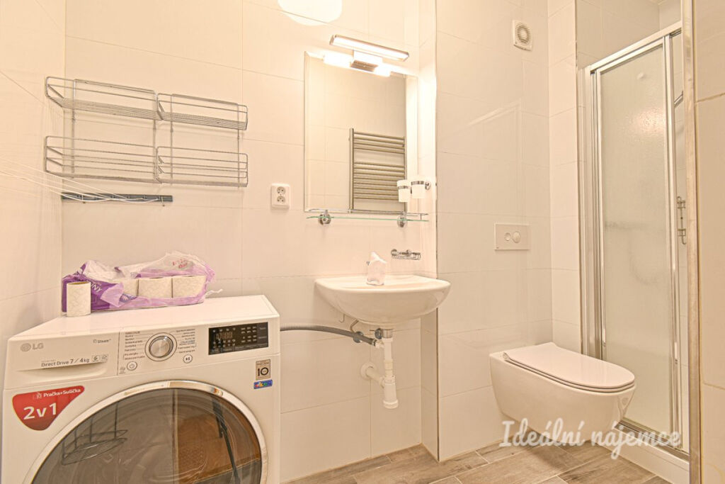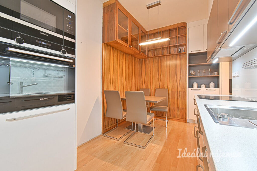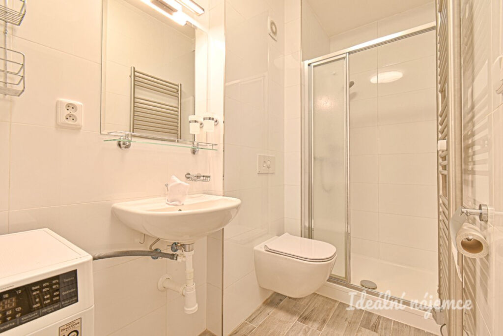 Byt se nabízí plně vybavený. Kuchyně disponuje lednicí, myčkou, elektrickou troubou, varnou deskou, mikrovlnnou troubou, digestoří, stolem a čtyřmi židlemi. V druhém pokoji najdeme pracovní stůl s židlí, šatní skříň, postel, televize a klimatizace. V koupelně je sprchový kout, umyvadlo, pračka se sušičkou a toaleta.
