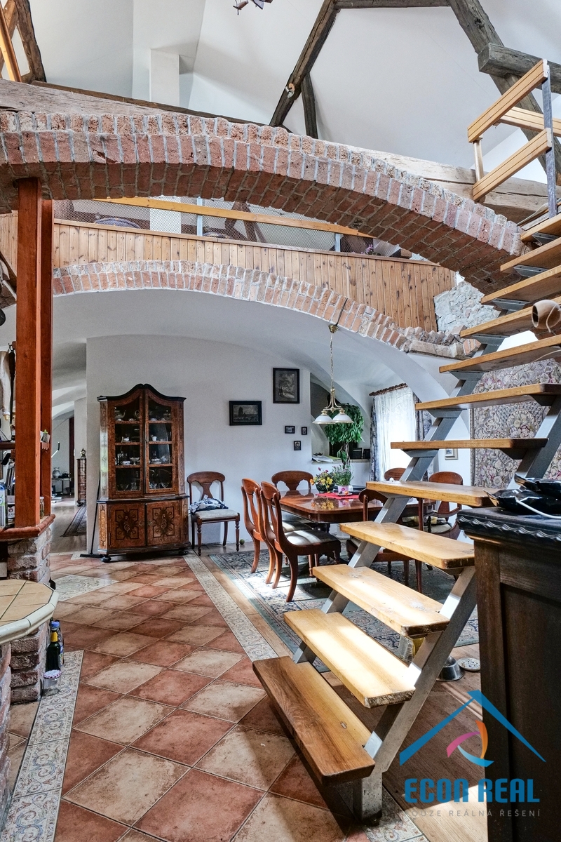 Kamenná stodola s garáží je krásným architektonickým počinem a bývalá konírna se může chlubit např. gotickým obloukem nebo původním románským portálem.