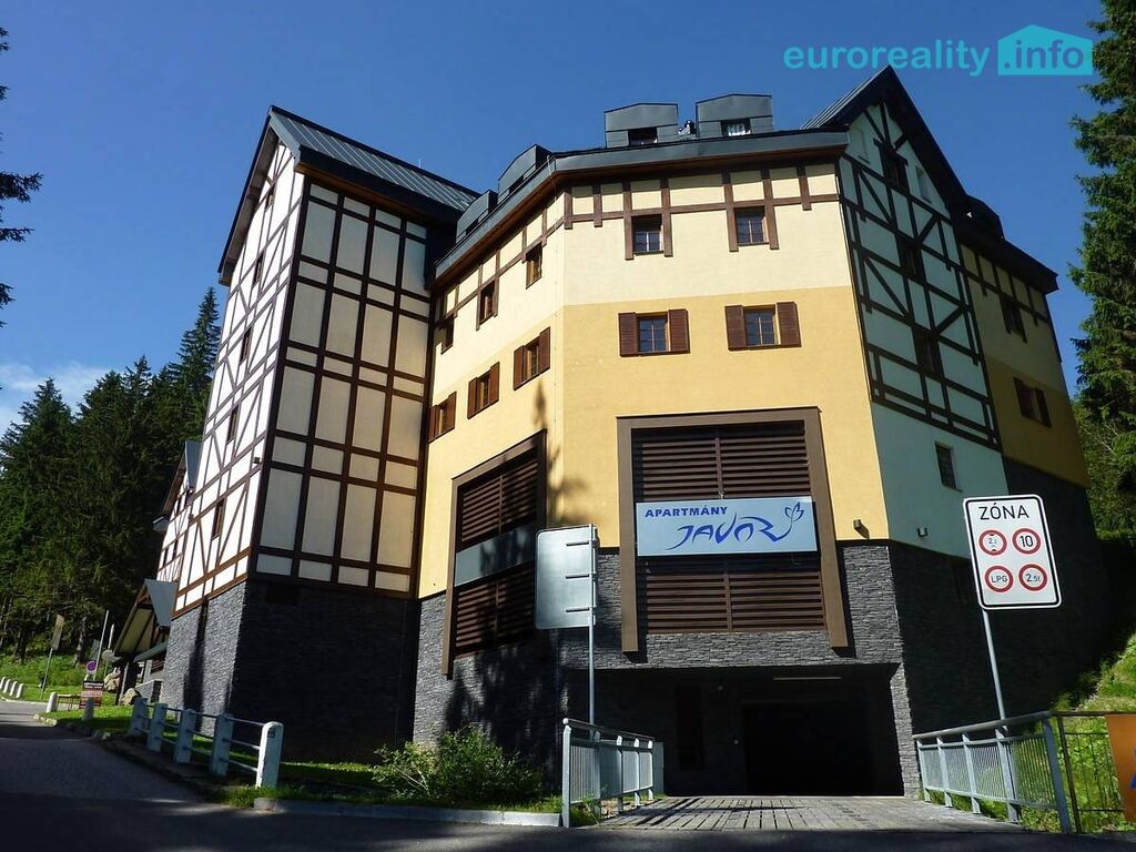 Apartmán je mezonetový, podkrovní, situovaný v posledních dvou patrech apartmánového domu Javor.