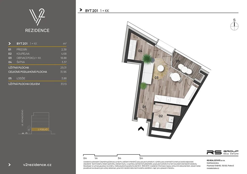 Nabízený byt o dispozici 1+kk a velikosti 32.2 m² je ve 2. patře a jeho součástí je lodžie o velikosti 3,9 m². K bytu je možné dokoupit sklepní kóji a parkovací stání (cena není zahrnuta do ceny inzerátu).