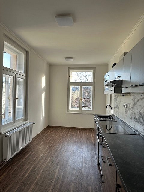 Dominantou bytu jsou veliké pokoje s okenními výklenky (28 m², 22 m², 16 m²), samostatná kuchyň (17 m²) a zcela jistě původní dvoukřídlé dřevěné dveře, historická krbová kamna a dřevěné parkety - dobrý stav, nová špaletová okna. Byt je vybaven vkusnou kuchyňskou linkou, vlastní plynový kotel, svítidla, neprůchozí pokoje - vše v nové čistě bílé výmalbě. Orientace bytu: jihozápad - jihovýchod, dům je bez výtahu / 66 schodů.