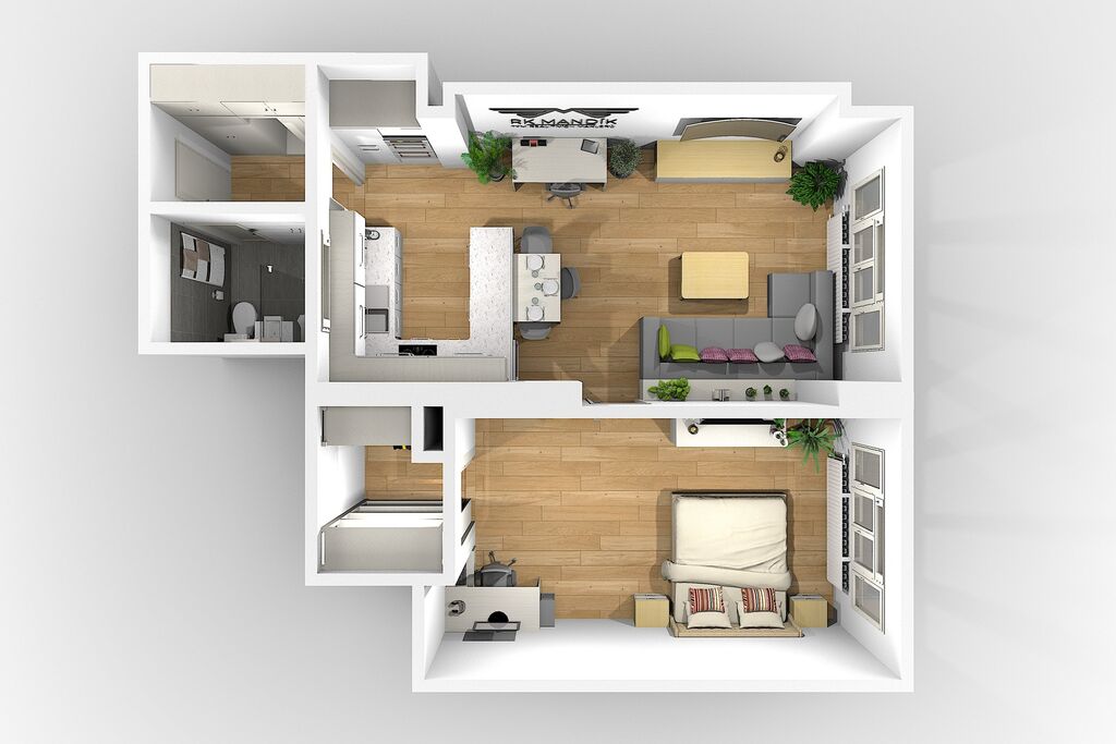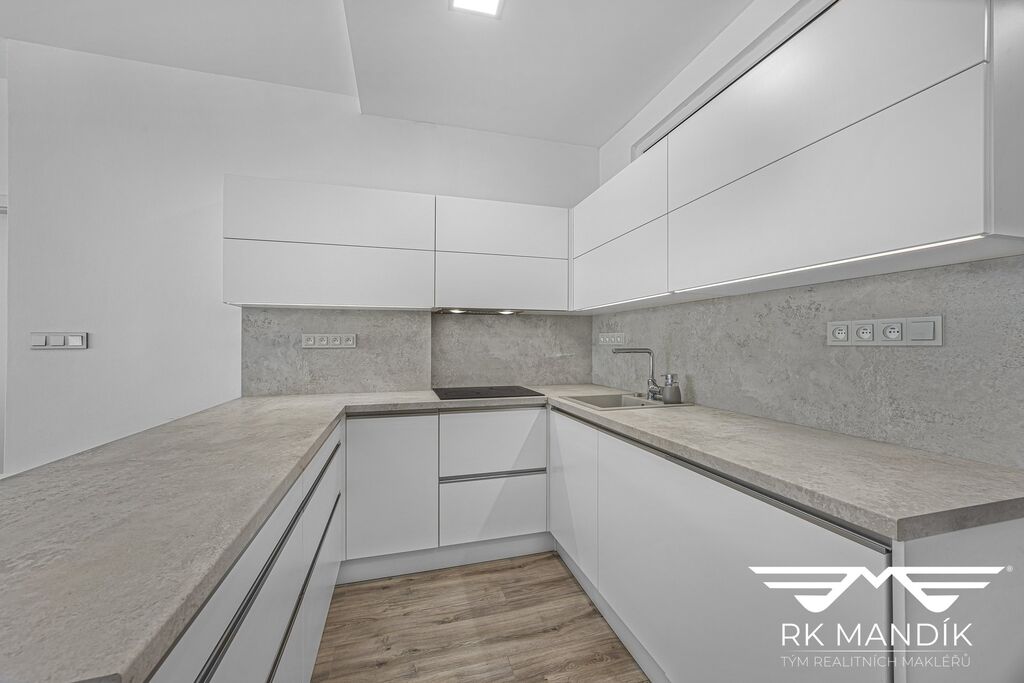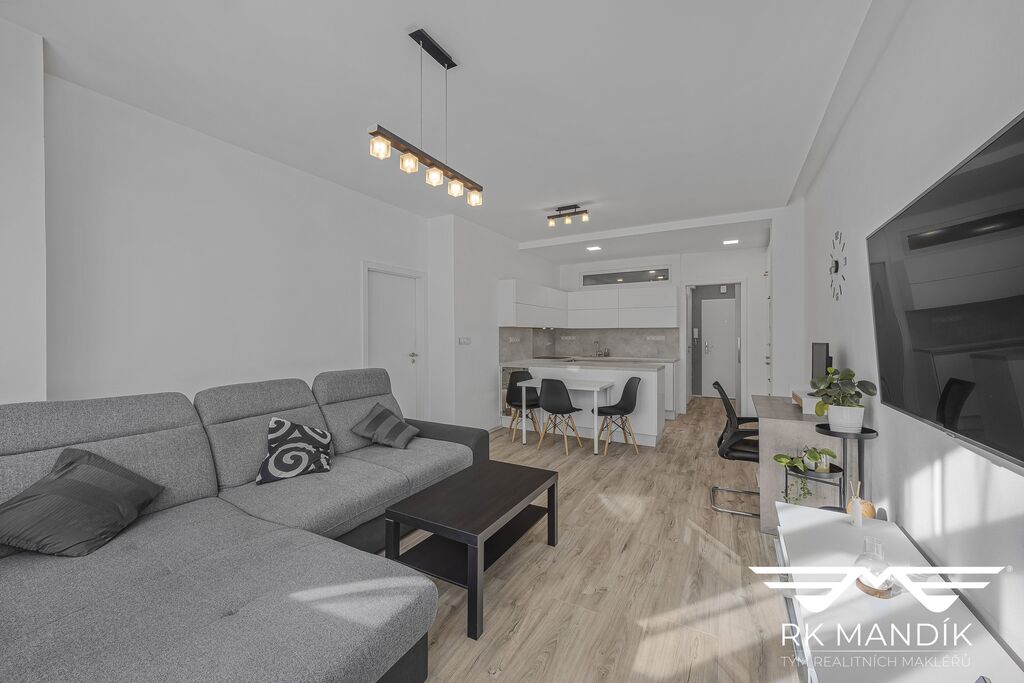 Byt tvoří prostorný obývací pokoj s jižní orientací, vybavený rozkládacím gaučem. Pokoj je plynule propojený s kuchyňským koutem. Kuchyňská linka je řešena moderně a prakticky, včetně vestavěných spotřebičů – elektrické trouby, sklokeramické desky, myčky nádobí, digestoře, mikrovlnné trouby, kombinované lednice a pračky se sušičkou.
