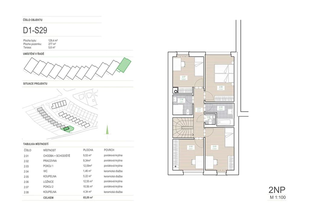 parkovacího stání. V patře se nacházejí čtyři samostatné pokoje a dvě koupelny,