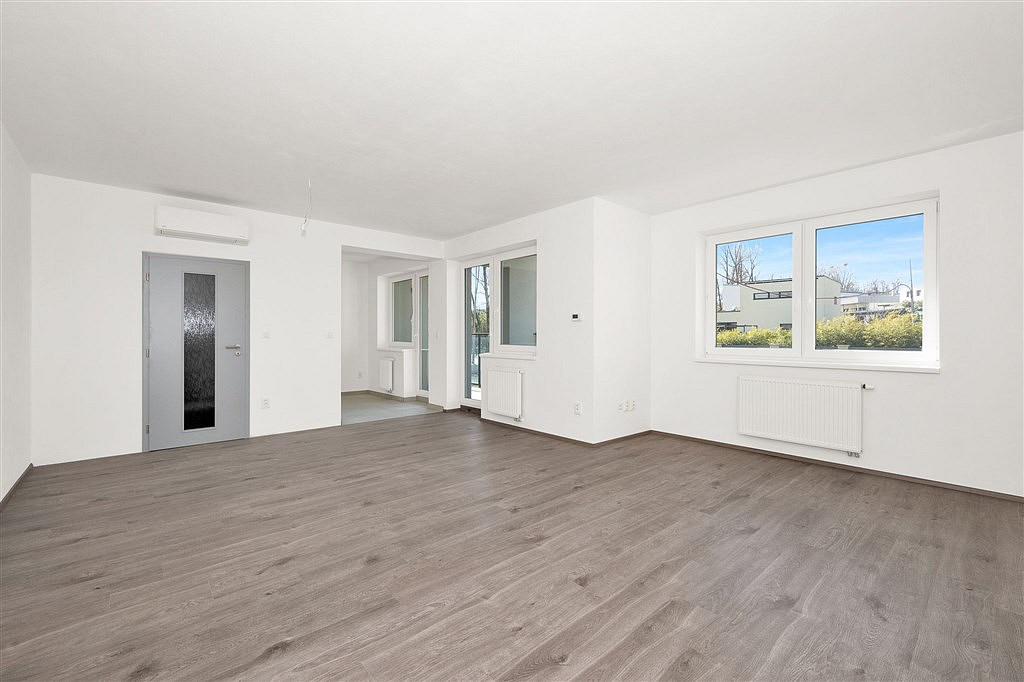 Skutečně pěkný a velkými okny prosvětlený byt, bude vybaven v pěkném standardu. Plynové kondenzační kotle umístěné v kotelně v suterénu domu nabízejí podlahové vytápění a v obou pokojích je rovněž klimatizační jednotka, která v létě chladí a v zimně může topit. Vstupní dveře s bezpečnostním kováním, vnitřní dveře s obložkovou zárubní. Plastová okna s izolačním trojsklem, plovoucí podlahy s vysokou odolností. Značkové vybavovací předměty v koupelně, velkoformátová keramická dlažba i obklady. Příprava na instalaci kuchyňské linky s digestoří (kuchyně není v ceně). Dekory a barevnost si můžete ve třech studiích doladit podle vašich představ. K bytu je možné zakoupit garážové stání v suterénu, nebo venkovní parkovací stání. Nízké provozní náklady na bydlení, a to jak díky jeho uspořádání, tak i díky použitým materiálům. Dům je zařazen v energetické třídě B, tedy velmi úsporný.