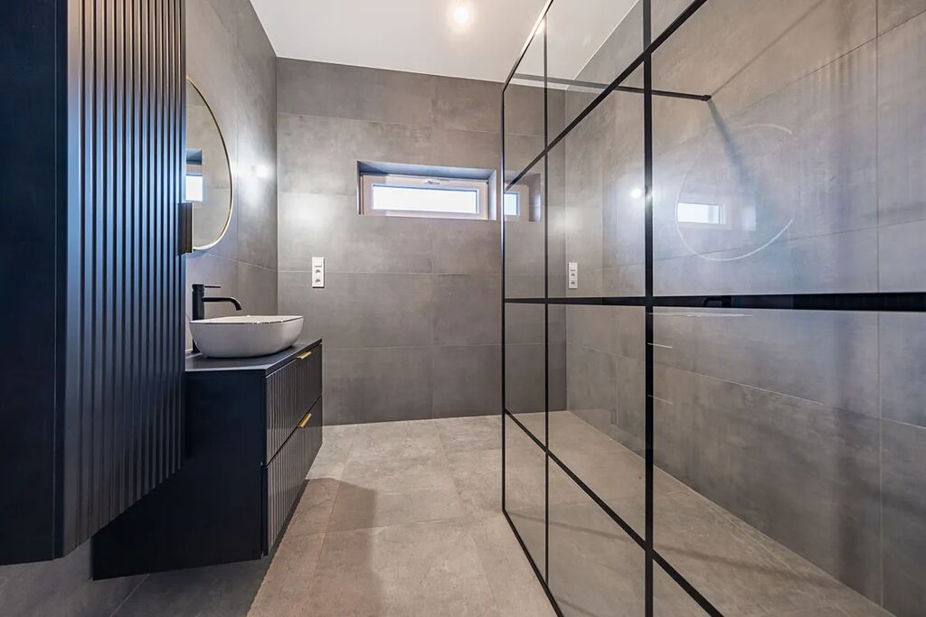 Dům nabízí také podlahové vytápění napojené na tepelné čerpadlo, plastová okna s trojskly a jednotný, příjemný design v tónu světlého dubu.