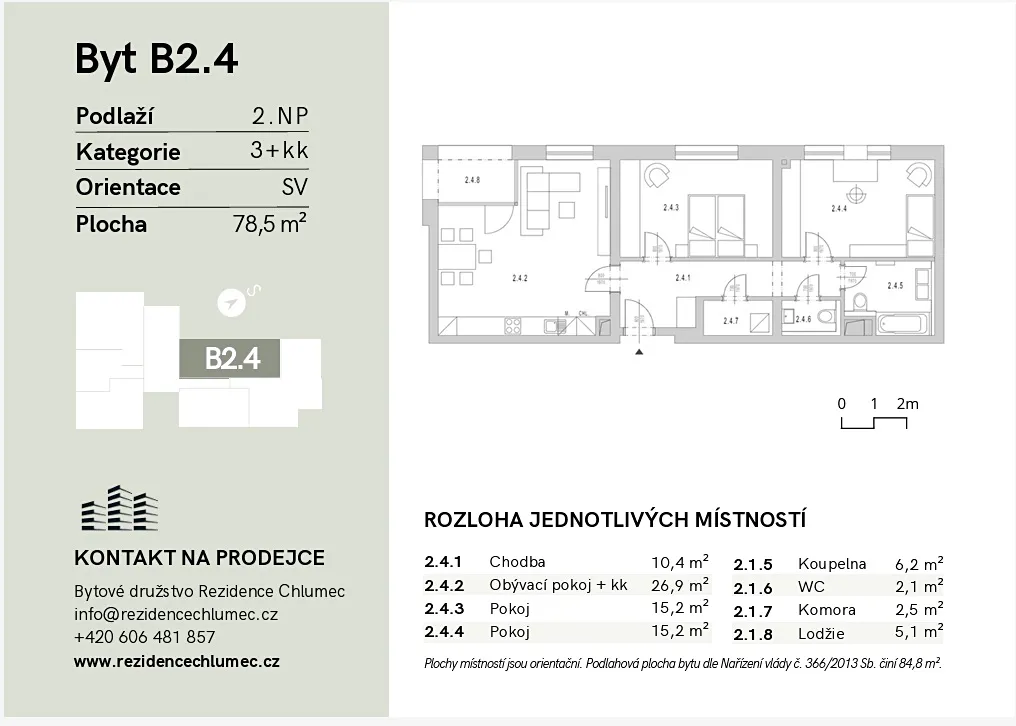 Nabízíme k prodeji byt č. 2.4 o velikosti 3+kk, 78,5 m2 + lodžie o celkové velikosti 5,1 m2.