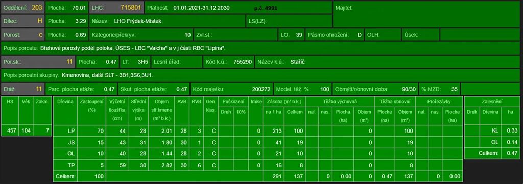 - p.č. 4991 vedená jako lesní pozemek o celkové výměře 8 605 m2, vlastníme 1/2 tedy 4 303 m2 (stáří lesa 108 let - hlavní zastoupení je lípa, jasan, olše, topol),