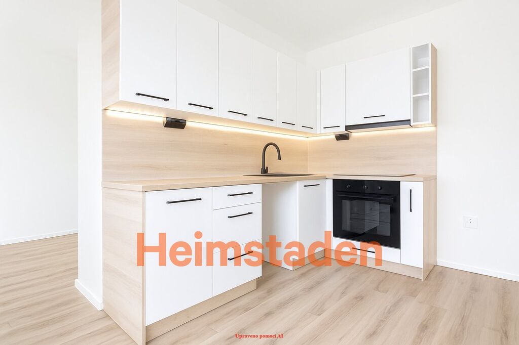 Srdcem bytu je moderní rohová kuchyně v kombinaci bílé a přírodního dřeva, která je vybavena vestavěnými spotřebiči a nabízí i prostor pro pračku. Každý detail zde byl promyšlen s citem pro estetiku i funkčnost.
