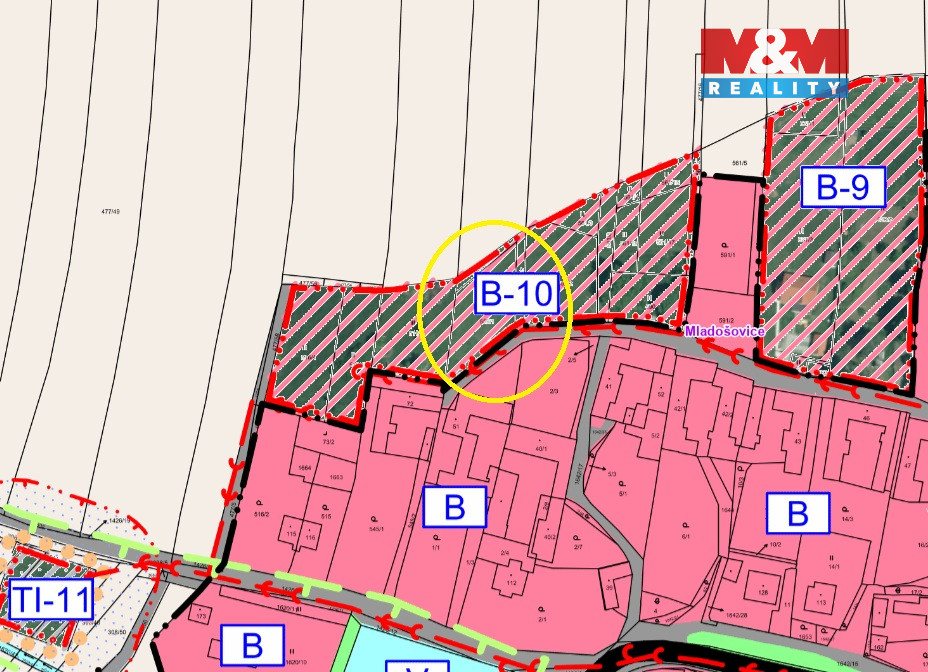 Pozemek o výměře 1 168 m² tvoří soubor tří parcel – p. č. 559/1, 561/1 a 561/7 – a je ideální volbou pro ty, kteří hledají soukromí, klid a zároveň snadnou dostupnost do Trhových Svinů (5 min) i Českých Budějovic (20 min). V lokalitě je vedena kanalizace, ostatní inženýrské sítě jsou v dosahu. Přístup je zajištěn ze stávající místní komunikace. Dle územního plánu obce Mladošovice se pozemek nachází v ploše B-10 – plochy bydlení, kde je přípustná výstavba rodinného domu s podkrovím a doprovodných staveb, jako je garáž, pergola, zahradní domek či bazén. Regulativy výstavby dle ÚP Mladošovice – B-10: