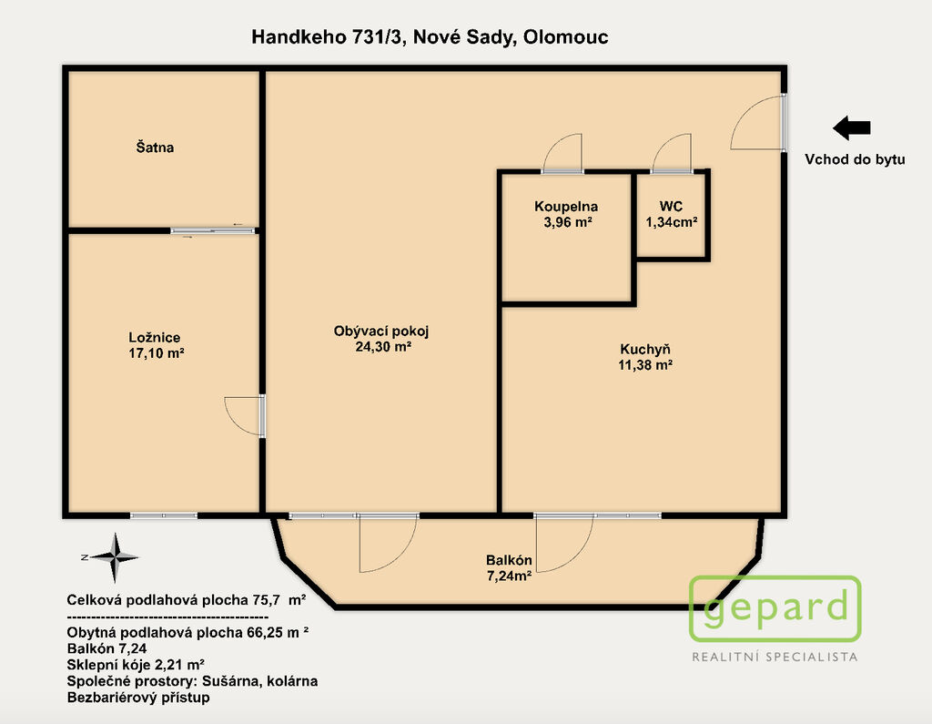 Byt tvoří předsíň s vestavěnou skříní, prostorná a vybavená kuchyně s jídelní částí (11,38 m²), obývací pokoj (24,30 m²), ložnice s oddělenou vestavěnou šatnou (17,10 m²), koupelna (3,96 m²), samostatné WC.