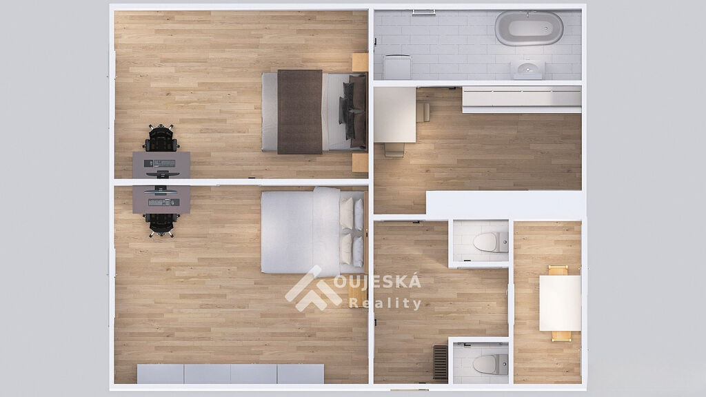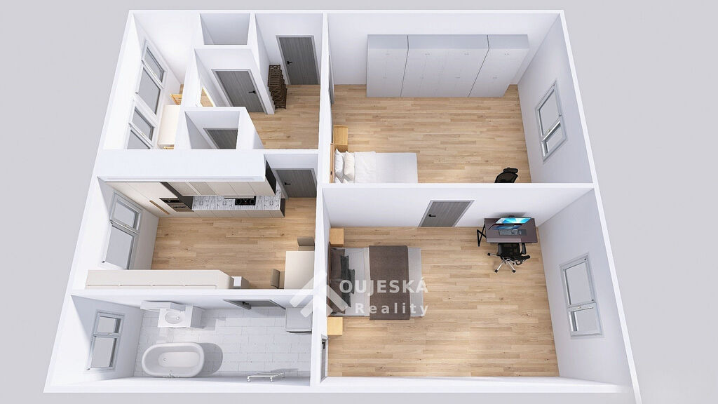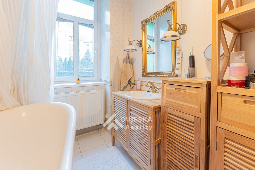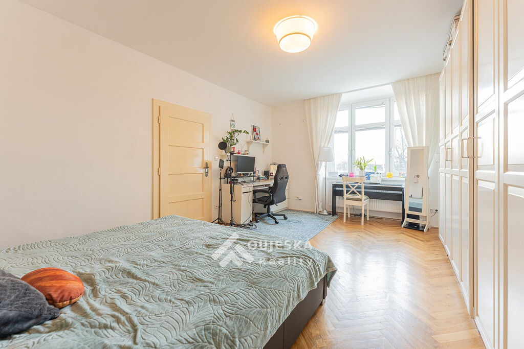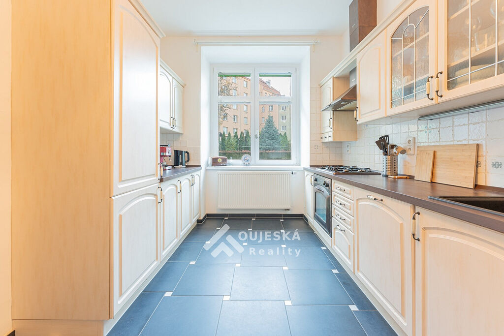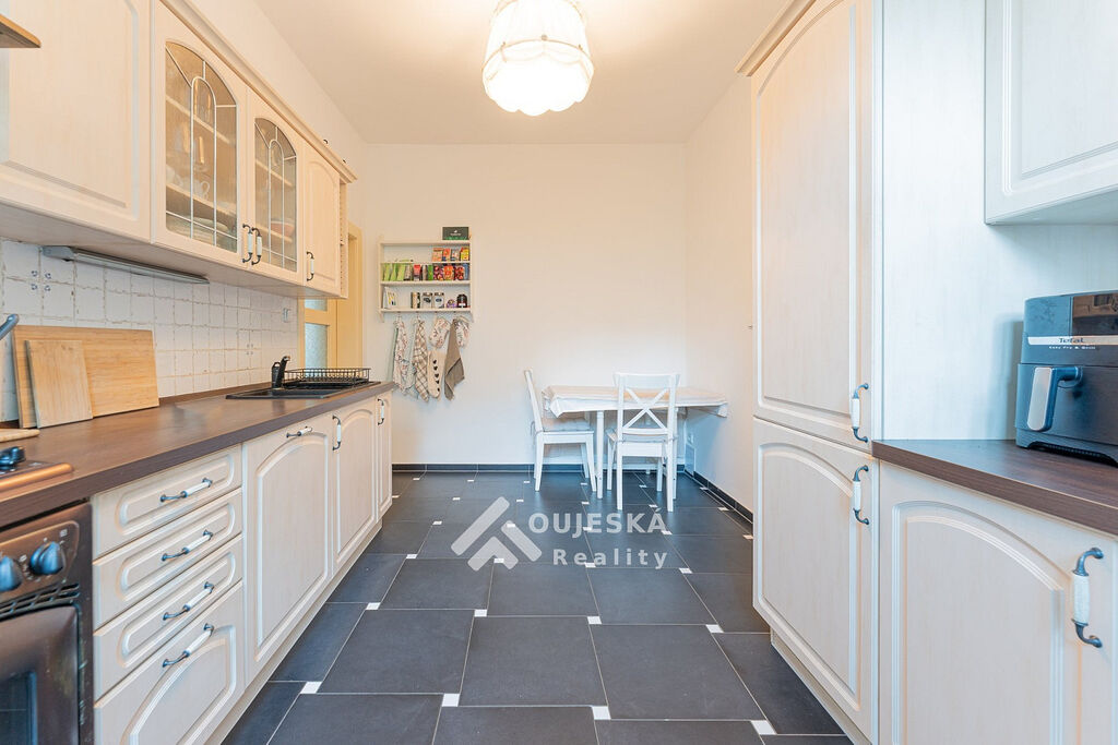 Byt o velikosti 83 m² se nachází v 1. patře cihlového domu. Nabízí pohodlný obývací pokoj, kuchyňský kout s jídelnou, prostornou ložnici, koupelnu s vanou a dvě samostatné WC. K dispozici je také lodžie.