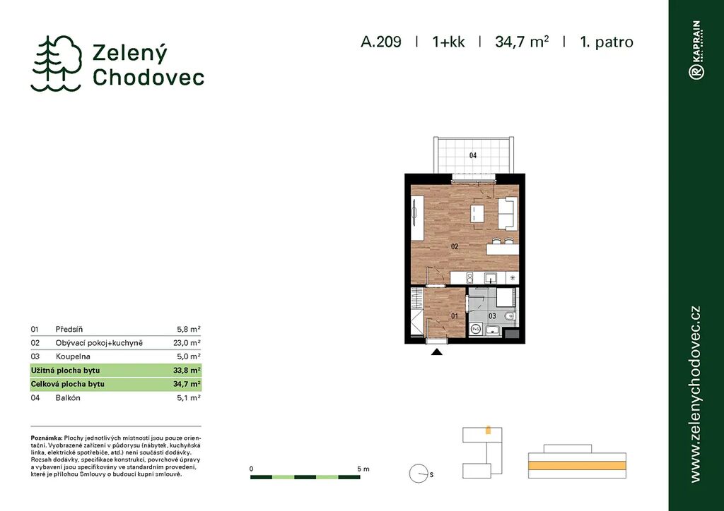 Byt 1+kk o celkové podlahové ploše 34,7 m² je situován v 1. patře projektu Zelený Chodovec.