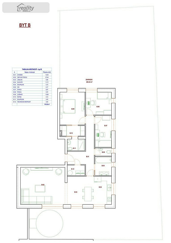 Výhodou projektu je možnost dokončení bytu materiály a sanitou dle výběru budoucího majitele. Kuchyň není součástí vybavení.