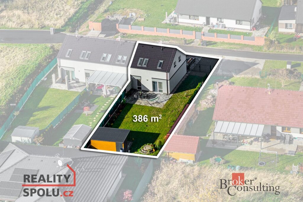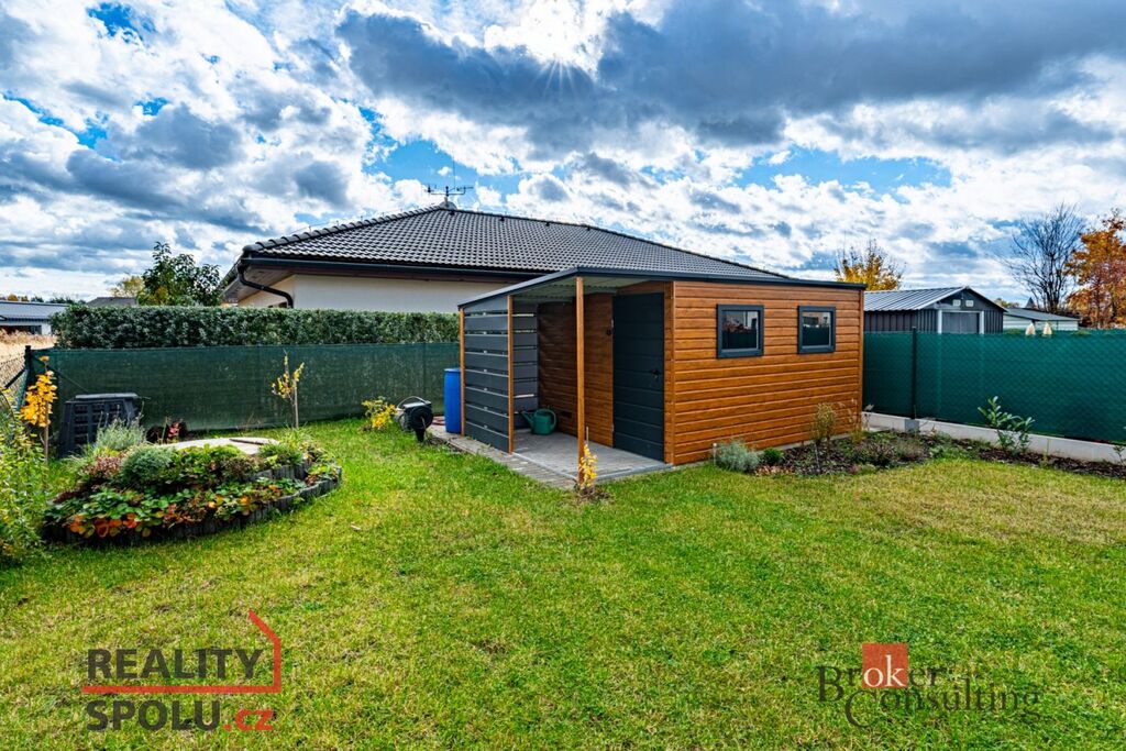 Součástí domu je zahrada s terasou a zahradním domkem, parkovací stání pro 3 vozidla a technická místnost sloužící jako menší sklad.