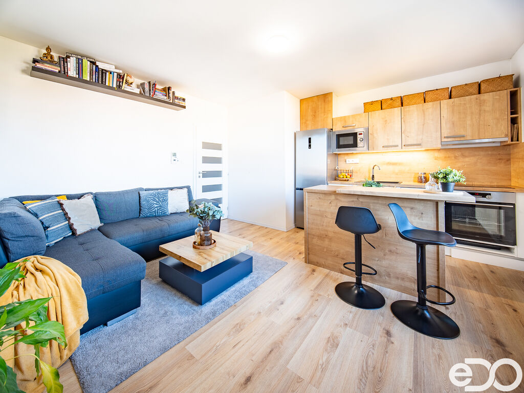 Praktické uspořádání nabízí vstupní chodbu, prostorný obývací pokoj s kuchyňským koutem, samostatnou ložnici, koupelnu se sprchovým koutem a oddělené WC.