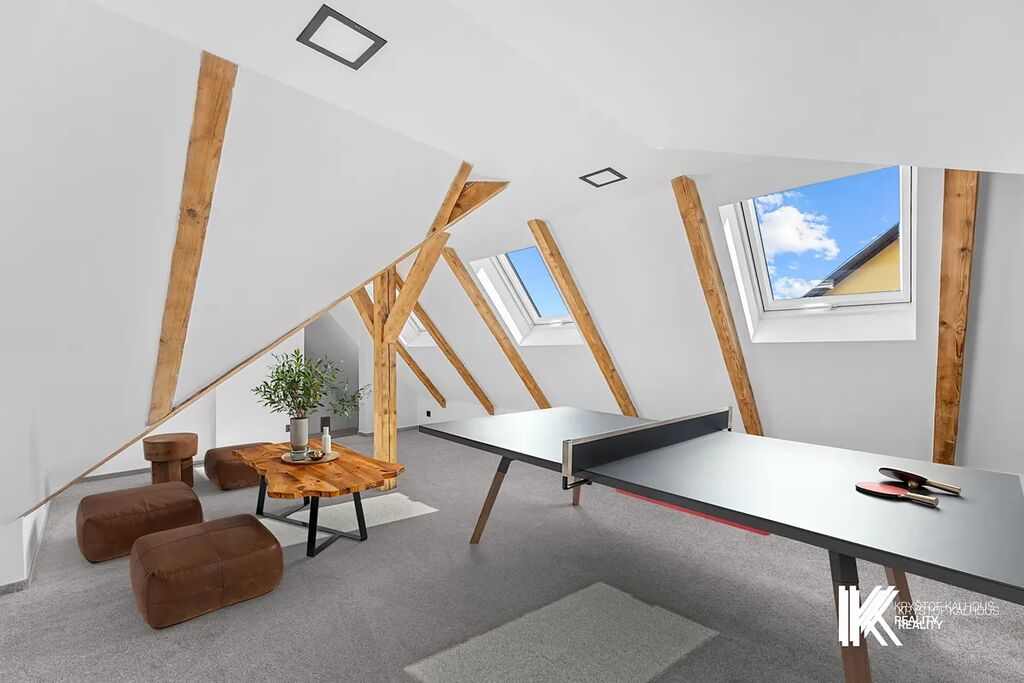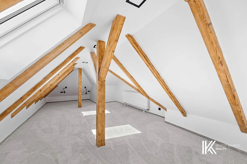 Dispozičně se jedná o 3+kk rozprostřené na dvou podlaží. Za vstupními dveřmi se nachází chodba se schodištěm, která propojuje jednotlivá podlaží. V přízemí je umístěna prostorná koupelna vybavená sprchovým koutem, toaletou a dvěma umyvadly. V prvním patře se nachází obývací části s moderní kuchyňskou linkou vybavenou vestavěnými spotřebiči – elektrickou troubou, varnou deskou, mikrovlnnou troubou, lednicí s mrazákem a myčkou. Kuchyňský prostor je doplněn o promyšlené úložné prostory po celém obvodu zdi. Od obývací části je masivními posuvnými dveřmi elegantně oddělena zadní část místnosti, kde může vzniknout ložnice. Ve druhém patře se nachází velká podkrovní místnost s odhalenými dřevěnými trámy, která prostoru dodává útulný a přirozený charakter. Skvěle poslouží jako dětský pokoj s hernou.