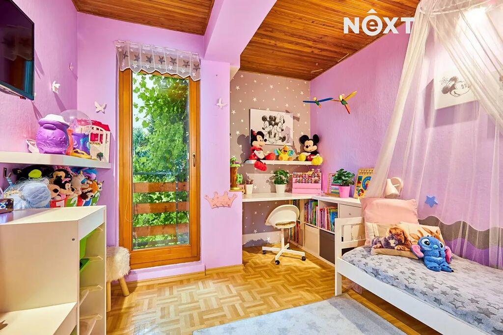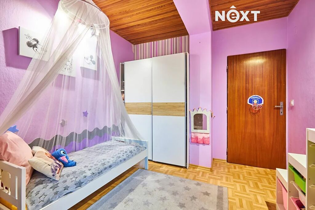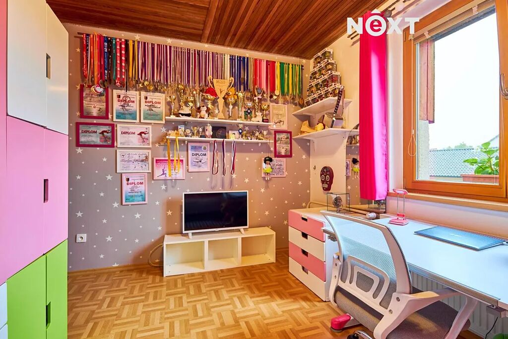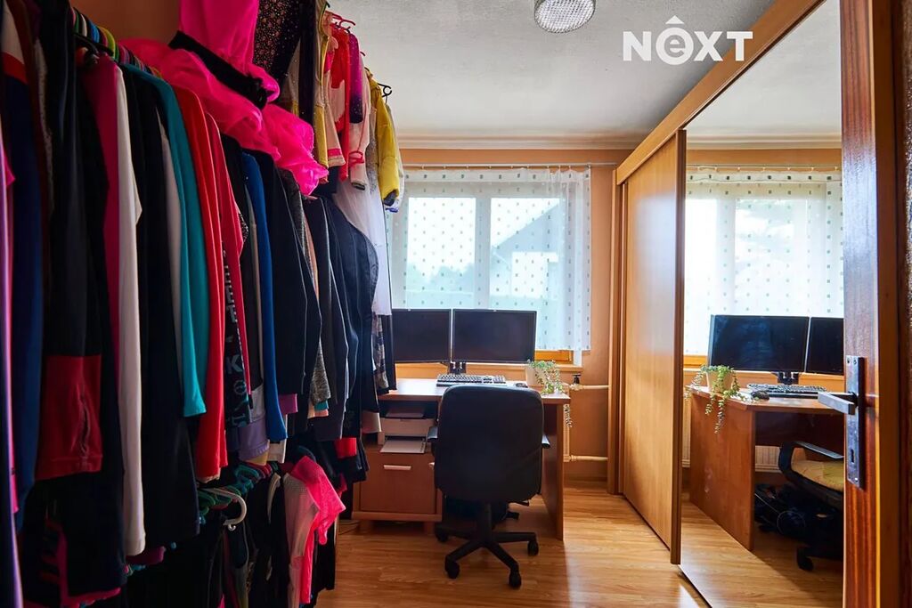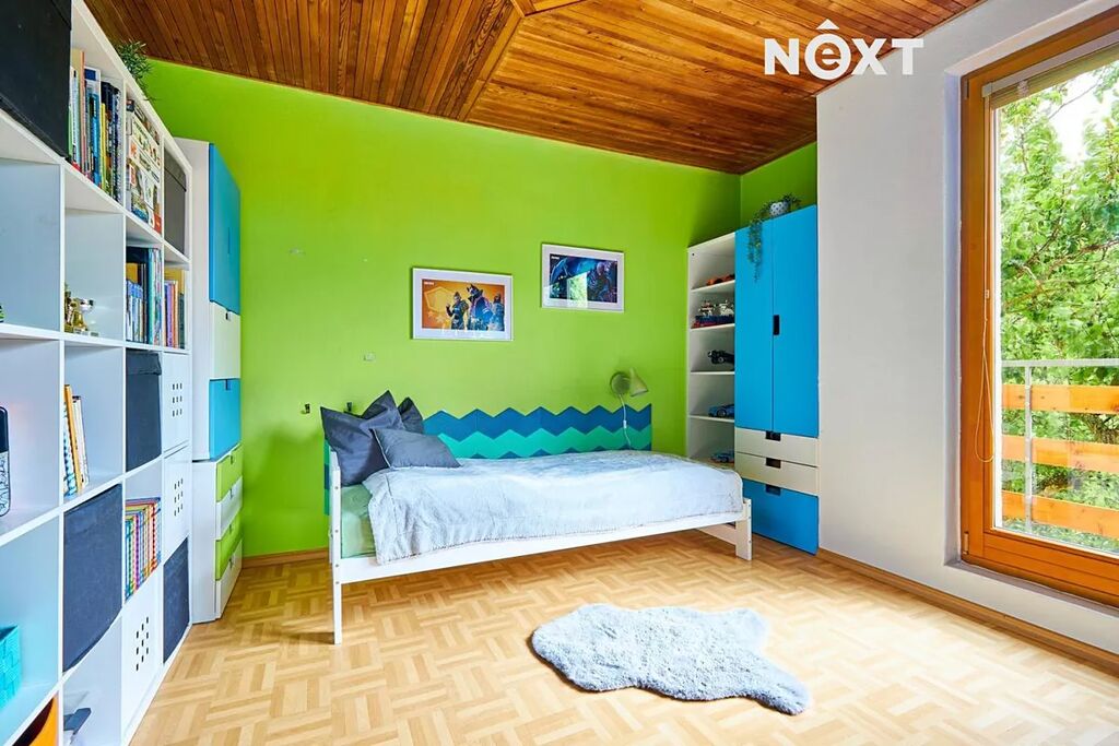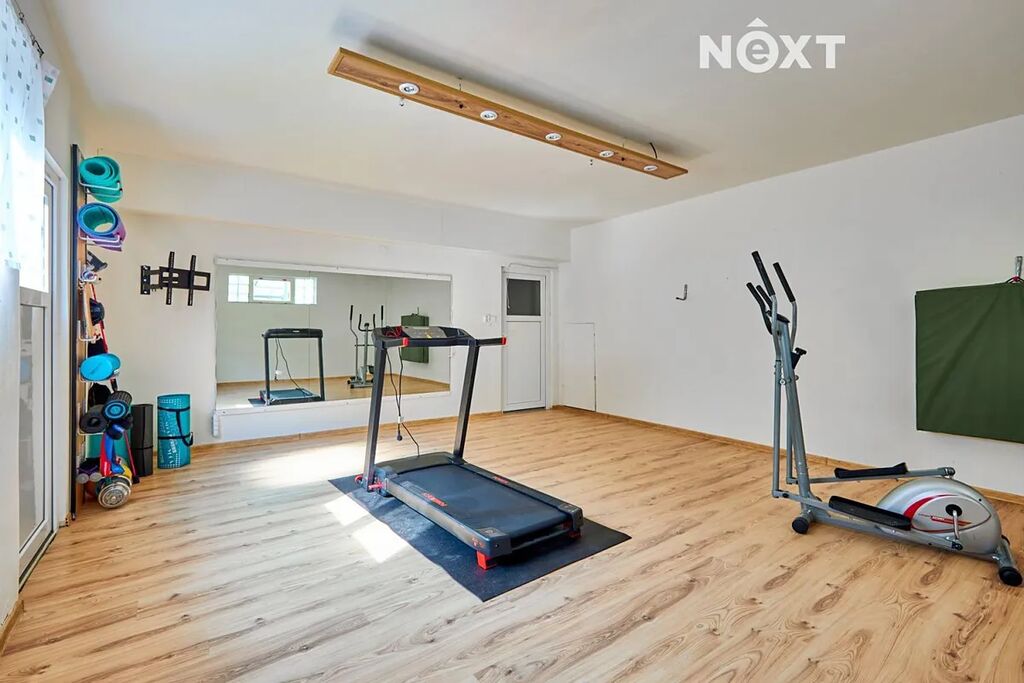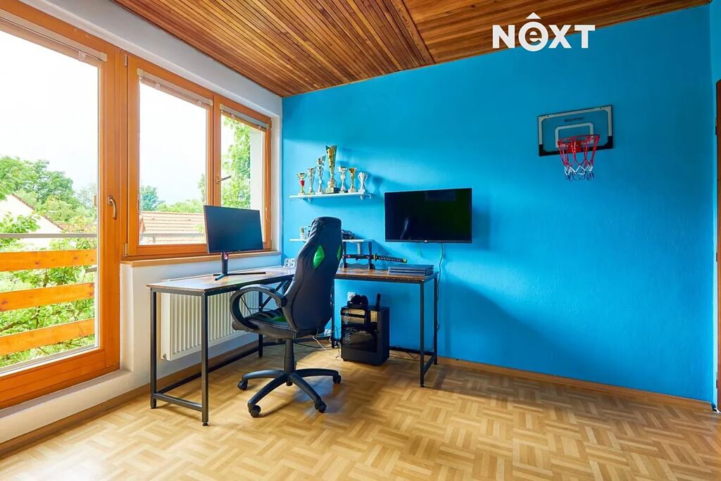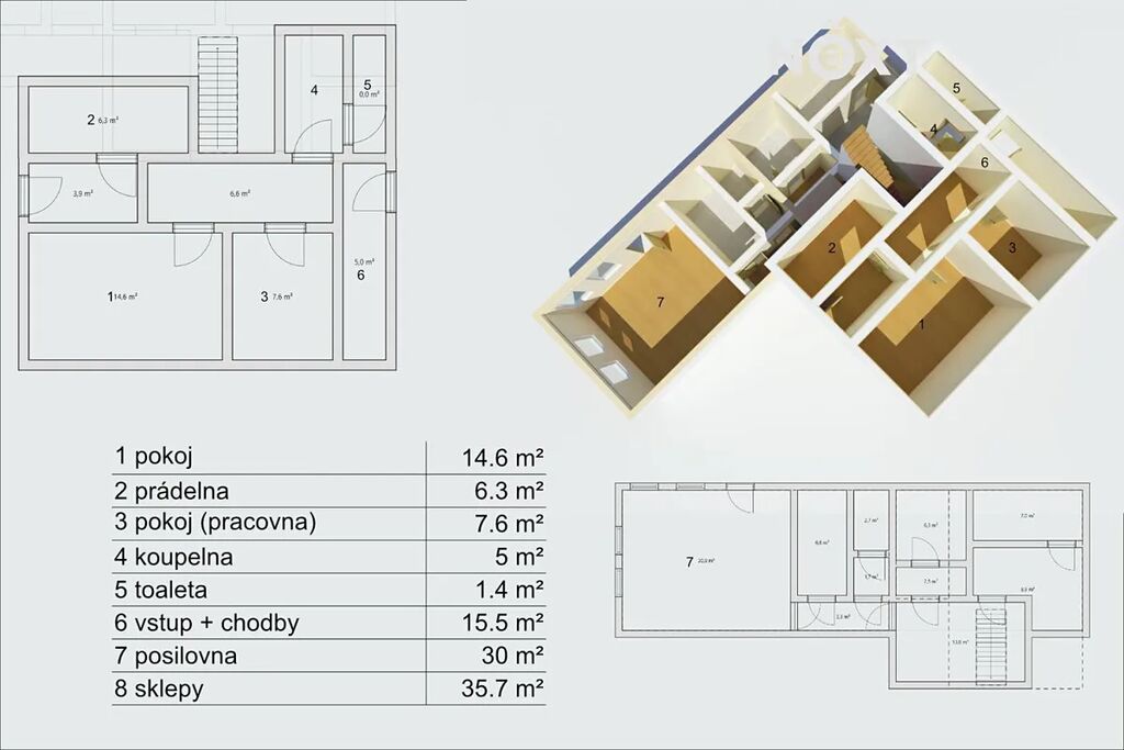 Dispozice pro rodinu, která chce prostor a propojení zároveň. V přízemí najdete pokoj pro hosty, pracovnu, koupelnu, samostatné WC a praktickou prádelnu. V patře vás přivítá velkorysý obývací prostor s výstupem na terasu, s kuchyní (55 m²!), čtyři další pokoje a druhá koupelna. A ve sklepě? Tam si můžete dát do těla v posilovně nebo si jen tak něco uložit – místa je tu dost.