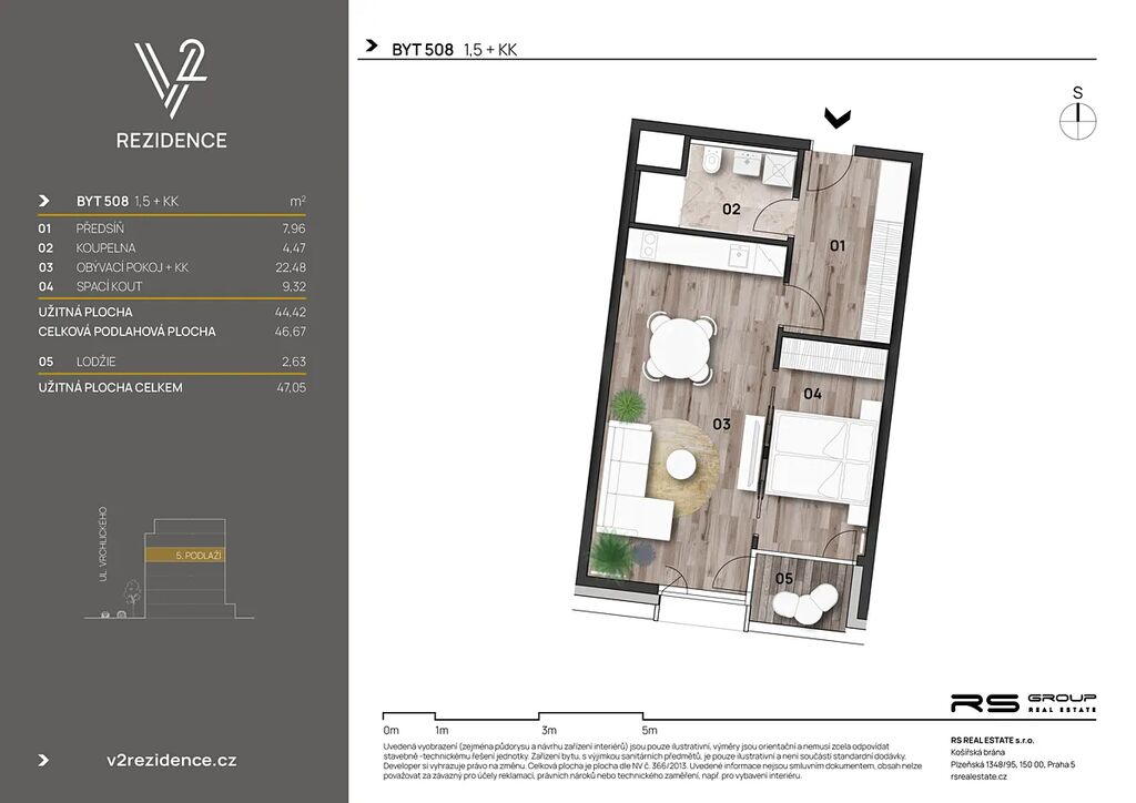 Nabízený byt o dispozici 1,5+kk a velikosti 46,67 m² je umístěn v 5. patře a jeho součástí je lodžie o velikosti 2,63 m². K bytu je možné dokoupit sklepní kóji a parkovací stání (cena není zahrnuta do ceny inzerátu).