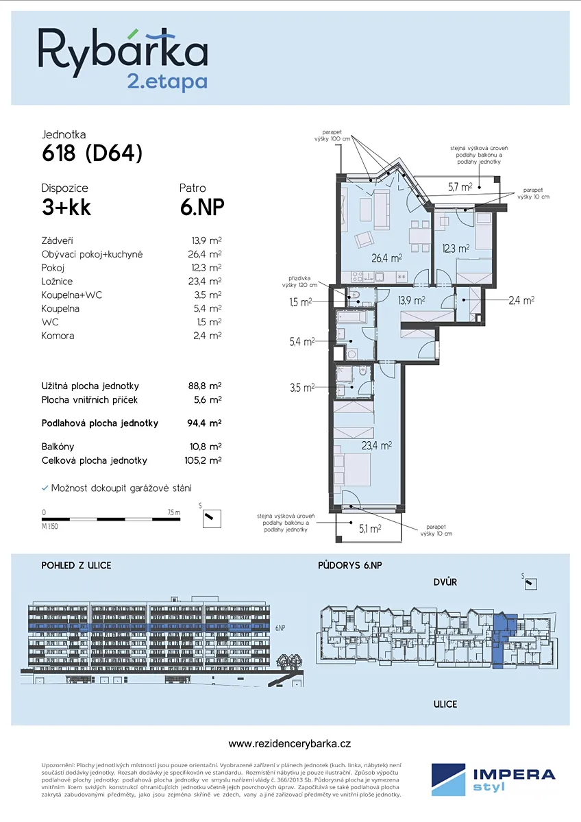 V rámci druhé etapy moderního rezidenčního projektu Rezidence Rybářka nabízíme k prodeji byt o dispozici 3+kk s podlahovou plochou 94,4 m², situovaný v 6. nadzemním podlaží osmipodlažní novostavby. Tento byt je ideální volbou pro ty, kteří hledají komfortní bydlení v centru města.