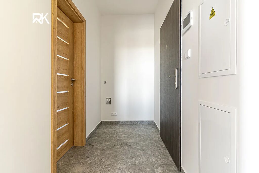 Byt je dokončen v nadstandardním provedení — kuchyňská linka a klimatizace jsou součástí ceny. Dispozice je praktická a plně funkční, ideální pro jednotlivce nebo pár.