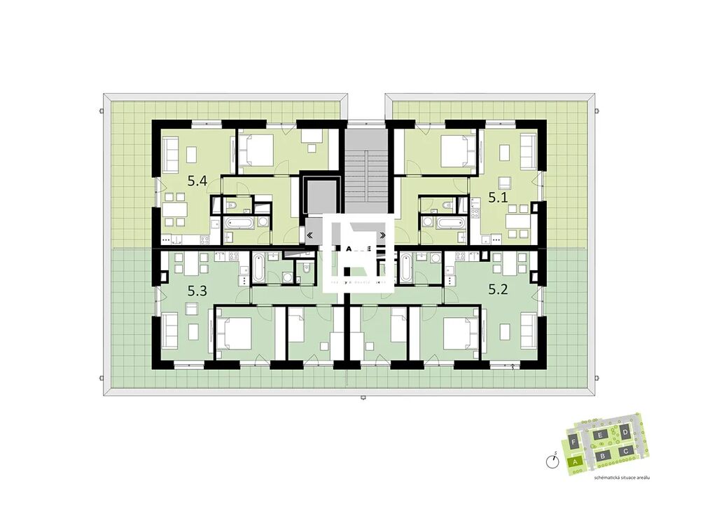 Byt s označením A5.1 o dispozici 2+kk se nachází v 5.NP pětipodlažní budovy „A“. Bytová jednotka má rozlohu 54,2 m2 k níž přísluší terasa o velikosti 28,72 m2.
