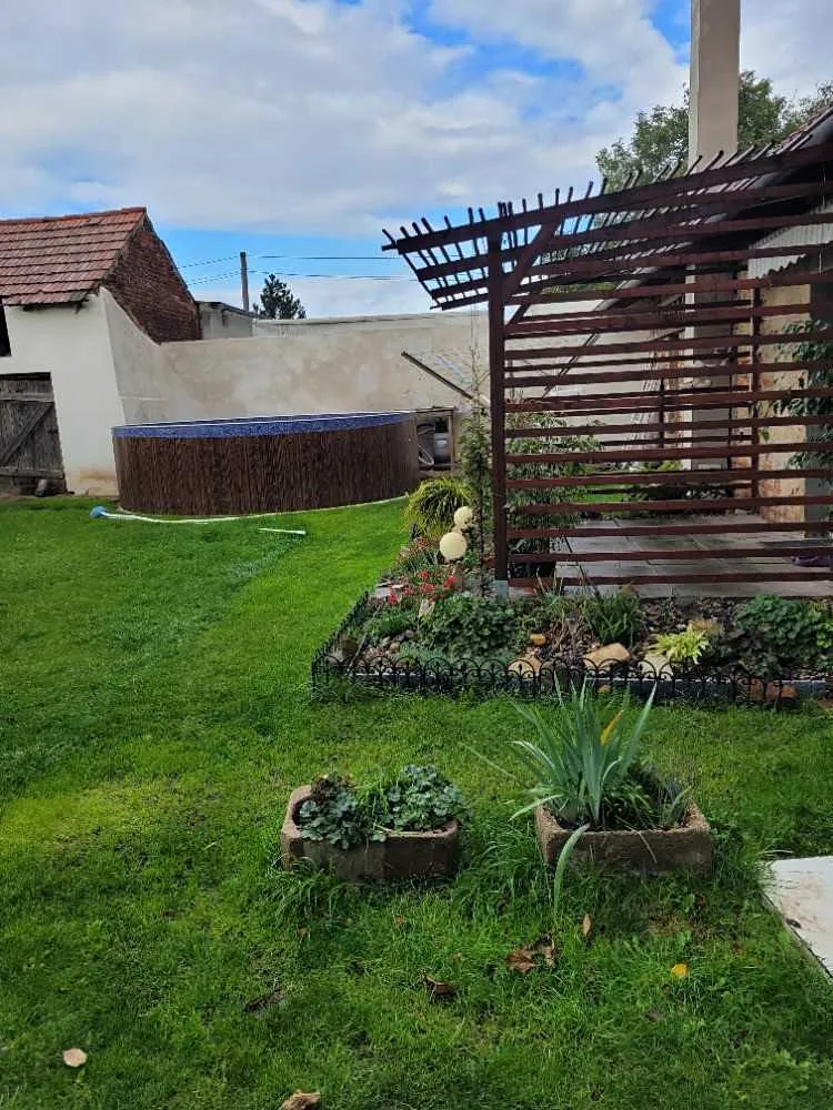nádvoří, které tvoří terasa s pergolou, bazénem a kůlna. Klidná obec