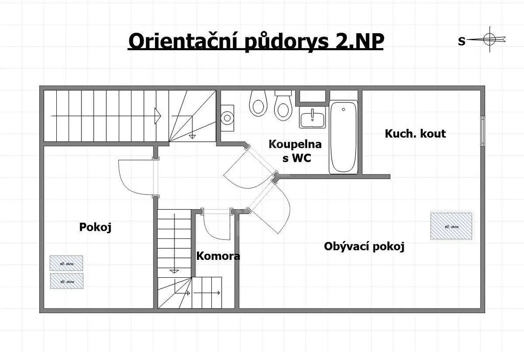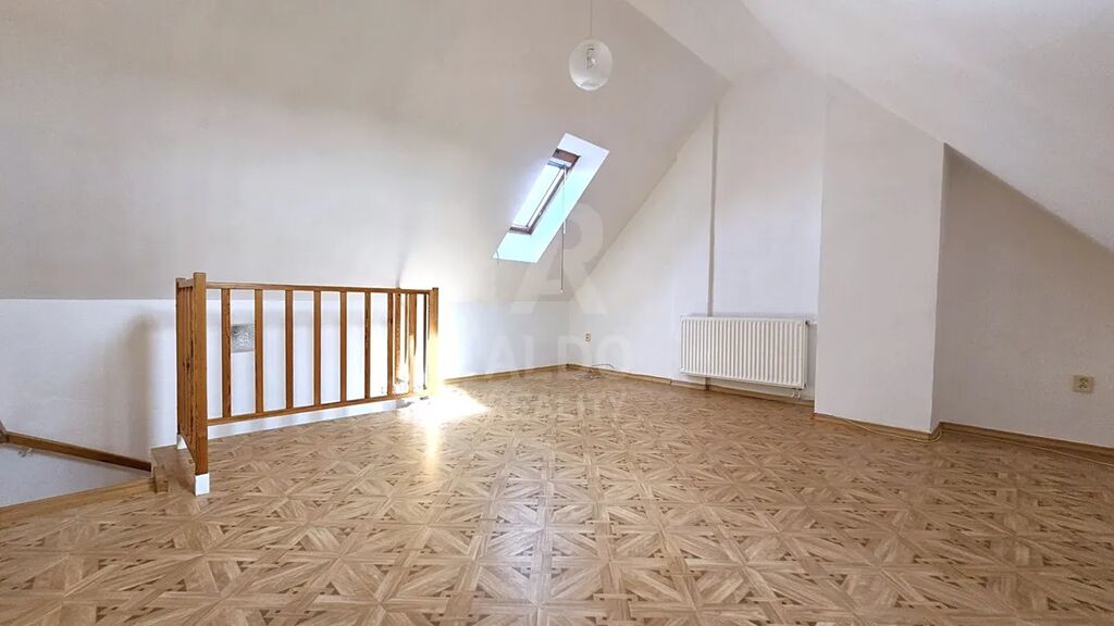 Bytová jednotka v patře má velikost cca 70 m2 je o dispozici 3+kk, přičemž jeden z pokojů je v mezonetu, koupelna s vanou, komora.