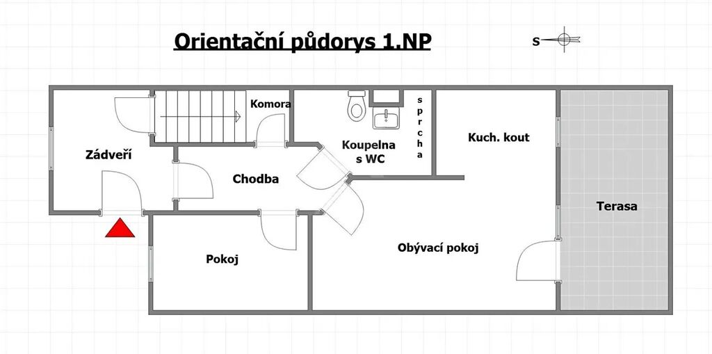 Bytová jednotka v přízemí domu má velikost cca 55 m2, je o dispozici 2+kk, francouzské okno na zahradu, koupelna se sprchovým koutem, komora.