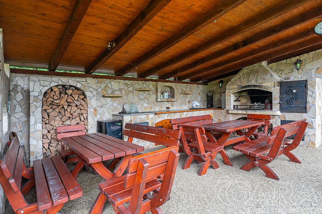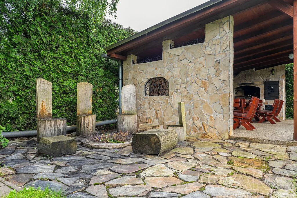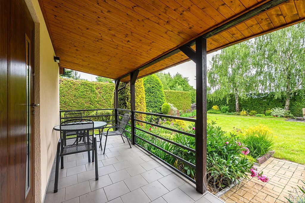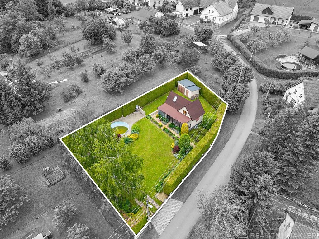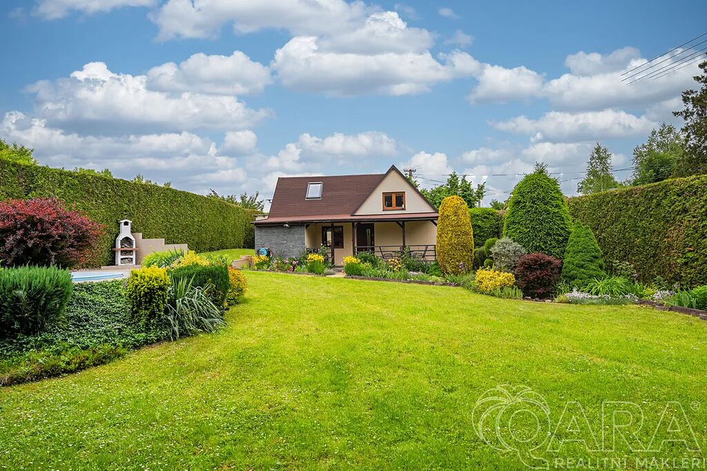 Zahrada je naprostým skvostem – okrasná, pečlivě udržovaná a díky vzrostlému živému plotu poskytuje výborné soukromí. Na pozemku se nachází garáž (aktuálně využívaná jako technický sklad a dílna), zastřešená kuchyň s posezením, udírnou, grilem a venkovním krbem. A pro horké dny? Bazén o průměru 3 metry je ideální volba.