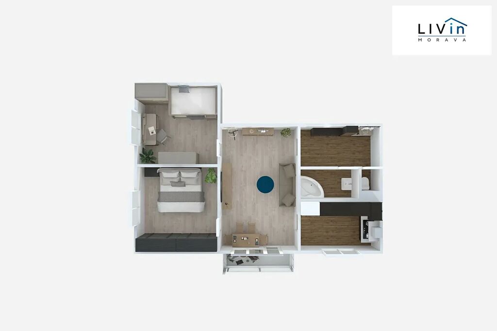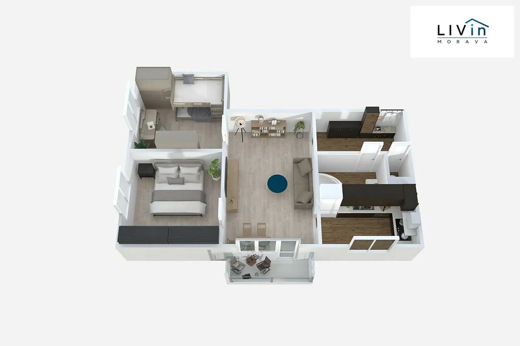 Byt je složen z chodby (5,5 m2), obývacího pokoje (19 m2), kuchyně (7 m2), ložnice (12,5 m2), dětského pokoje (11,5 m2), koupelny (3,5 m2) a samostatného WC (1 m2). K bytu náleží lodžie (3 m2) a prostorná zděná sklepní kóje 4 m2 v 1PP. V domě je k dispozici společná kolárna a kočárkárna.