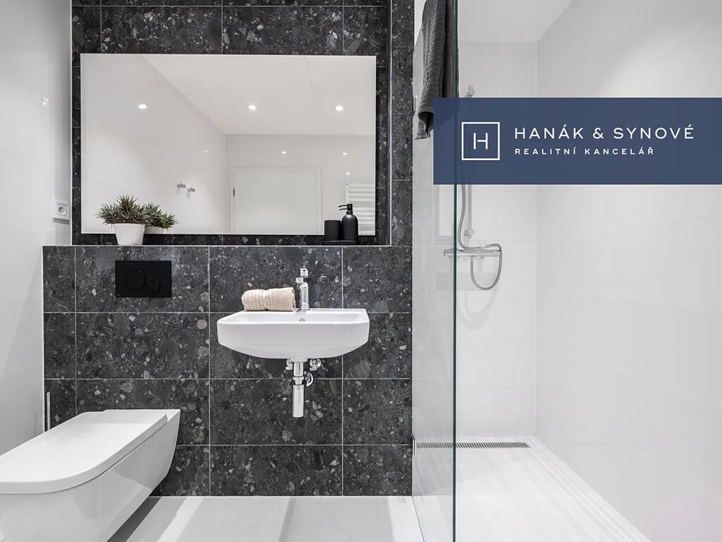 •Prostorná moderní koupelna: Koupelna se sprchovým koutem, podsvíceným zrcadlem, toaletou a pračkou
