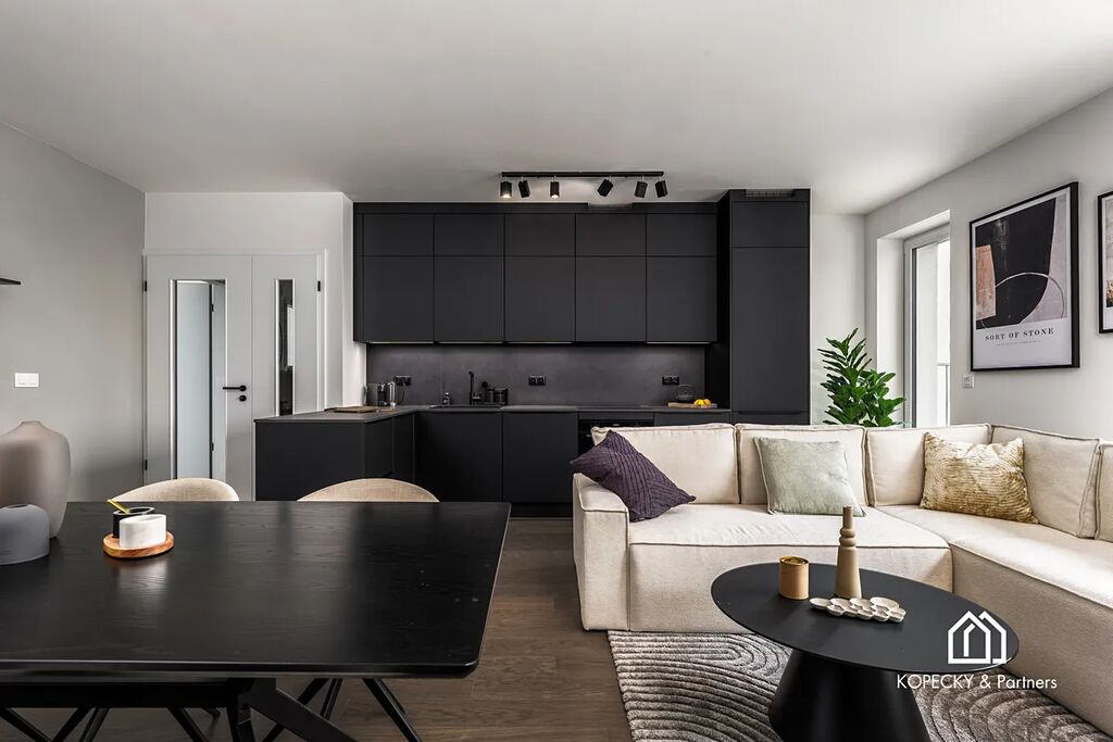 Byt o užitné ploše 115 m² je navržen tak, aby splňoval náročné požadavky na pohodlí i praktičnost. Hlavní obytnou část tvoří světlý obývací pokoj s kuchyňským koutem o rozloze téměř 30 m², který je díky velkým francouzským oknům příjemně prosvětlen a nabízí dostatek prostoru pro rodinné posezení nebo setkání s přáteli. Nechybí zde tři prostorné ložnice a další samostatná místnost, kterou lze využít jako pracovnu, dětský pokoj či pokoj pro hosty.
